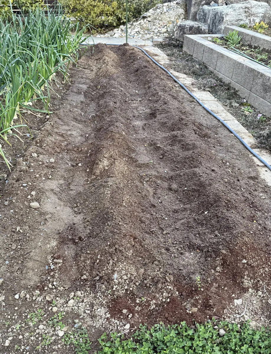 写真ではわかりにくいのですが、畝を作ってキタアカリを植えた後です。