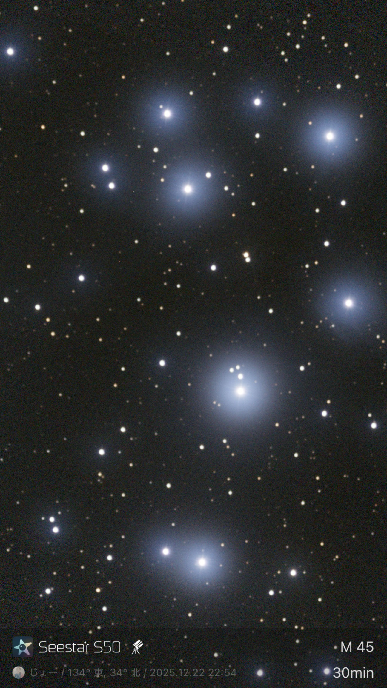今日は、冬至です。プレアデス星団「すばる」が空高く上がっていたので、SeeStar S50で撮影してみました。この望遠鏡は満月の大きさがちょうど良い視野なので、六連星すべてを入れられませんが、フレームと画像のズーム機能で収めました。最近のファームアップで、バックグランドでも撮影できますので、車内で漫画も読めます。