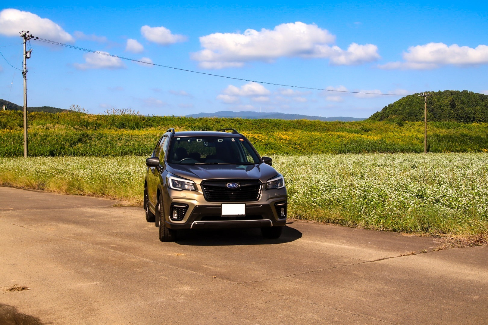蕎麦の花と青空に流れる雲とフォレスター 良いですね〜 ^_^