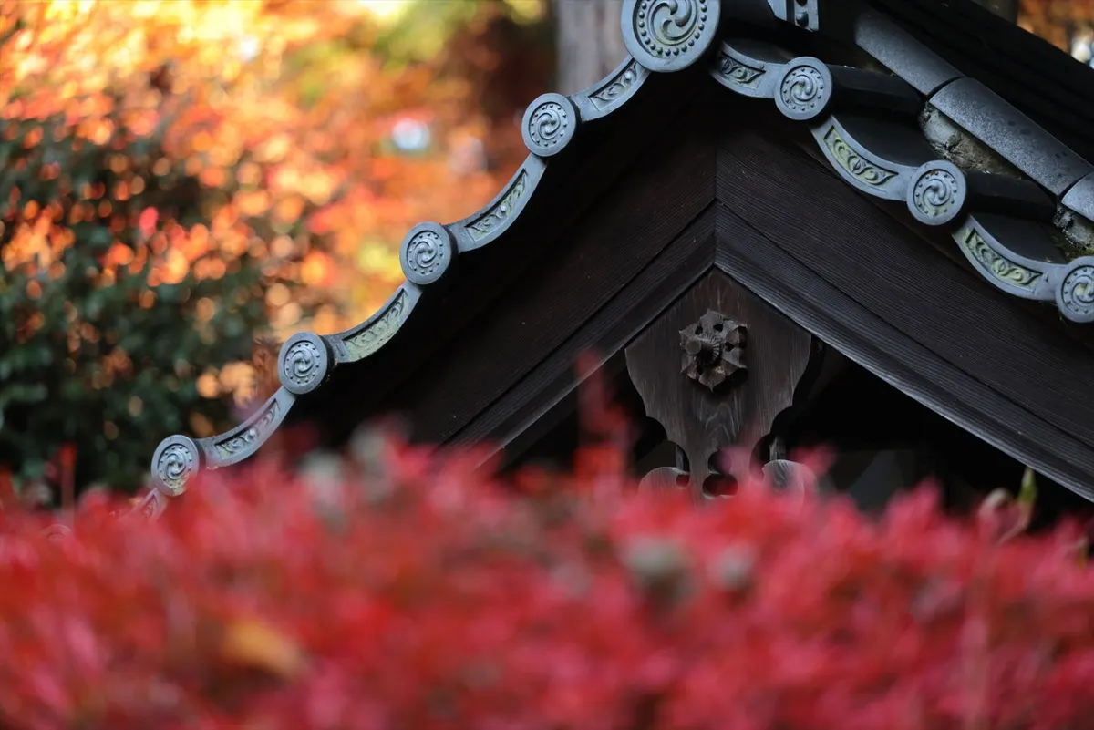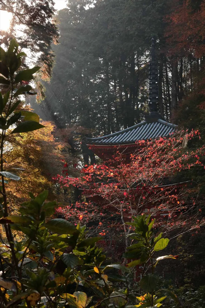8. どうだんつつじの生け垣が真っ赤に紅葉していて、何とか三重塔を絡められないかなと考えたのですが無理でした…。なので山門の瓦屋根と絡めてみました。