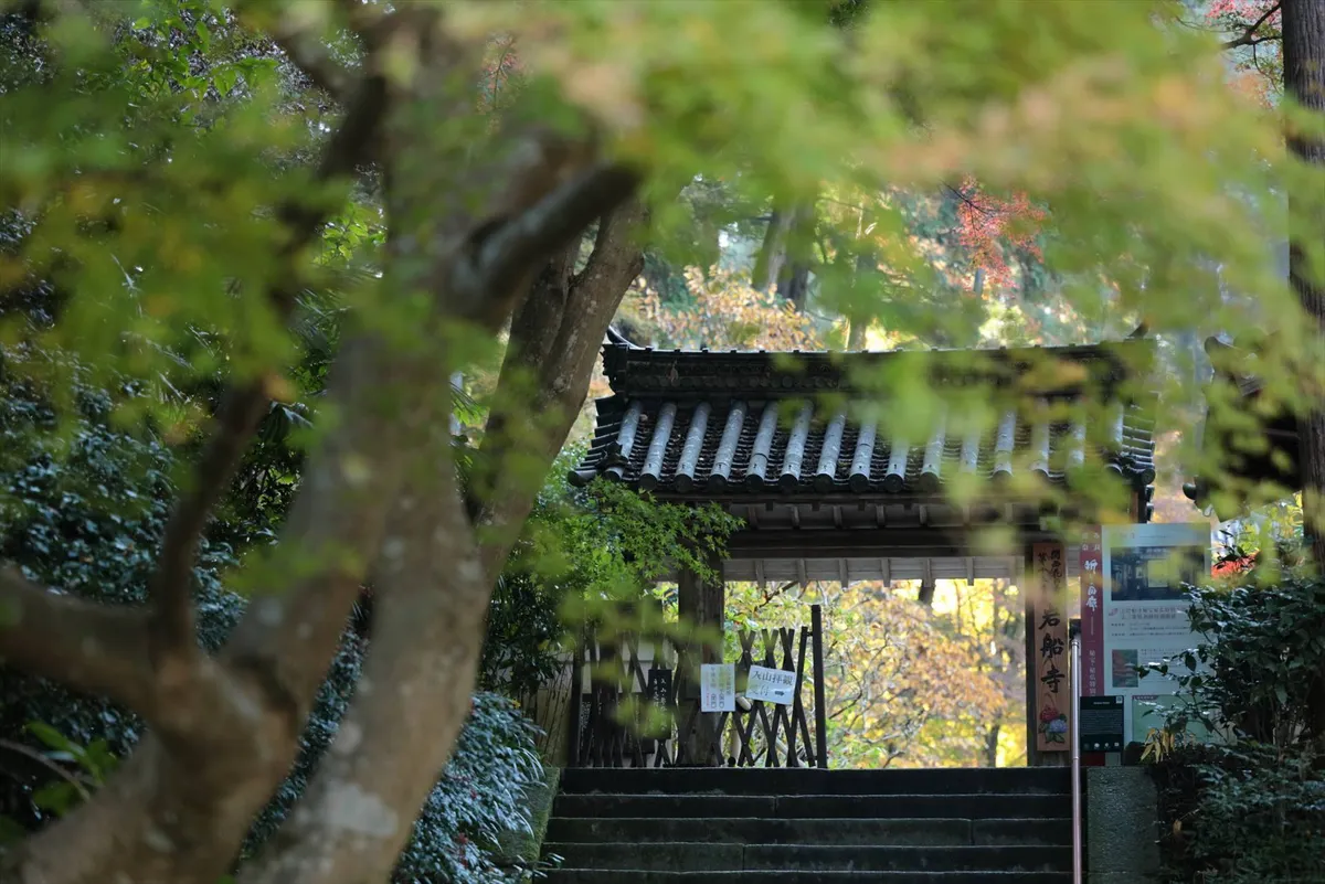 2. 最初の目的地の「岩船寺」の門前のもみじはまだ青々としてました。拝観料は500円です。