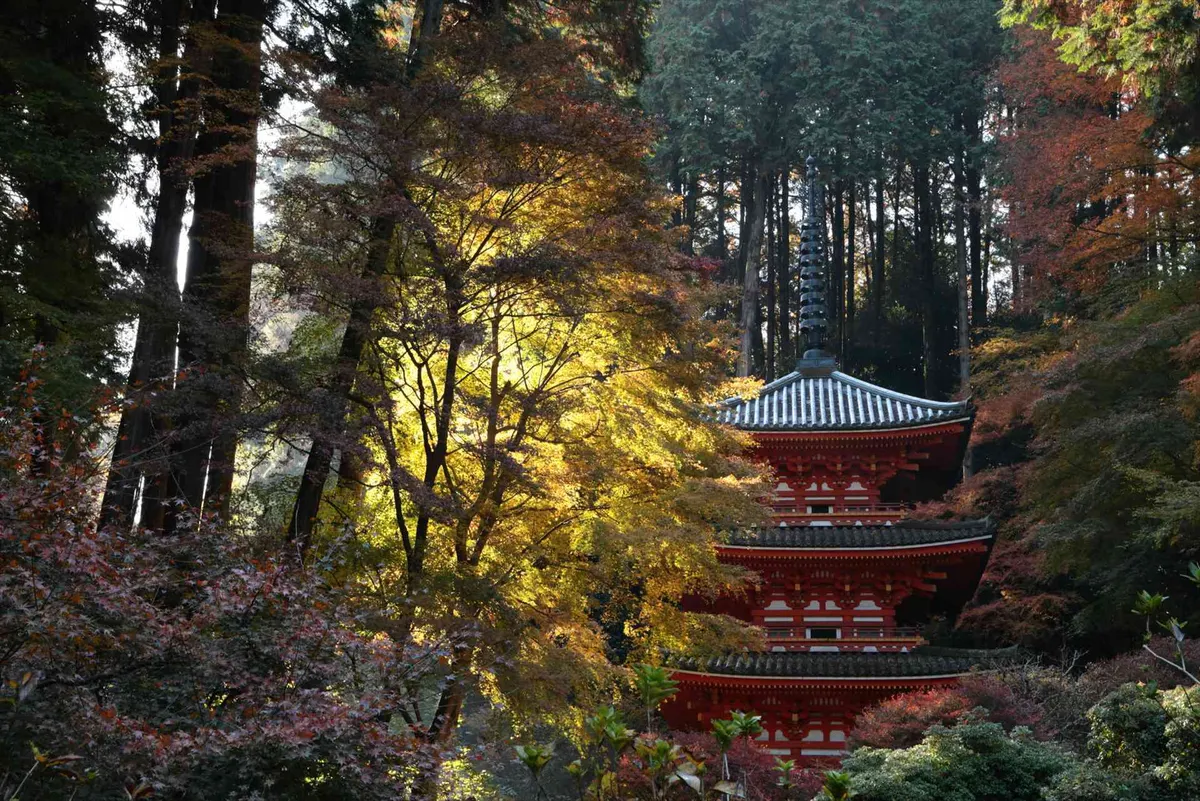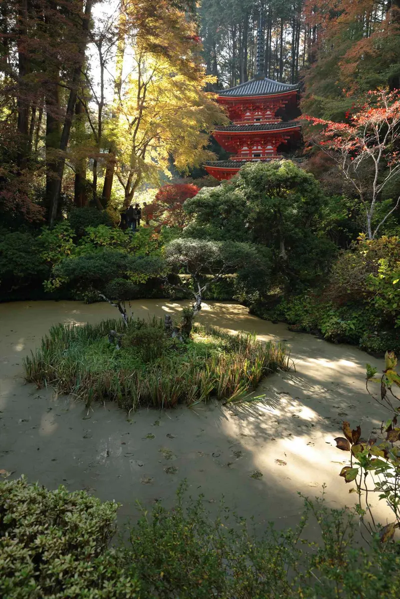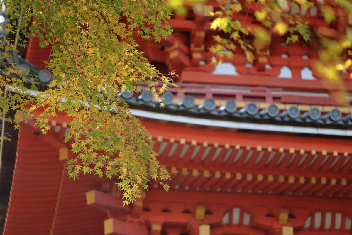 7. まだ赤くなってないもみじとオレンジの三重塔もいいですね。