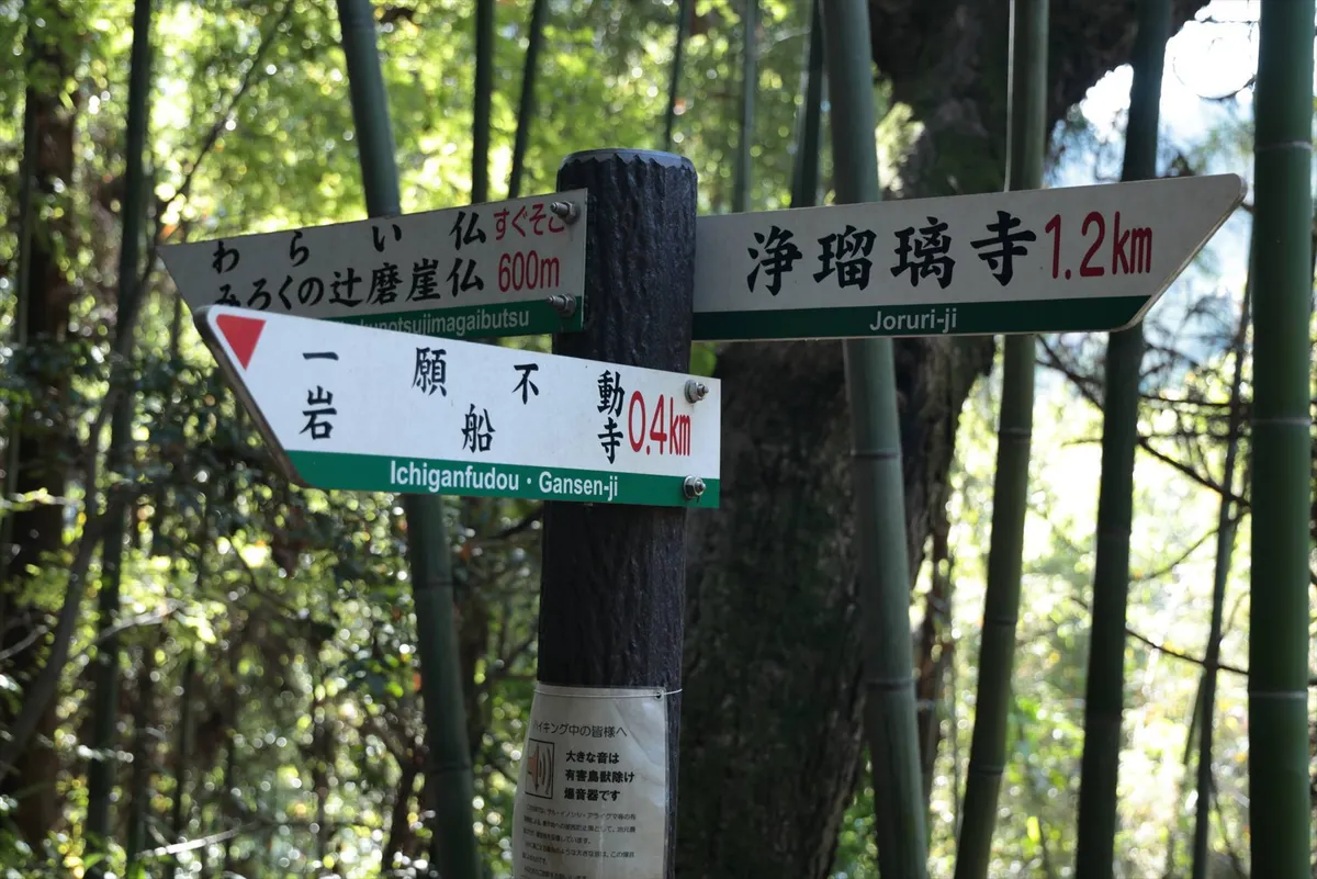 11. 岩船寺を出て徒歩5分ほど、いよいよ最初の石仏とご対面です。こちらは鎌倉時代に造られたとされる一願不動(岩船不動明王立像)。一心にお願いすると、1つだけ願い事を叶えてくれるそう。でもその表情は少々お怒りのご様子・・・ これは人間を叱っている姿を表しているそうなのですが、願いを叶えてくれるということを考えると、叱ることもまた愛情の裏返しでしょうか。それでは次の石仏に向けて歩を進めます。