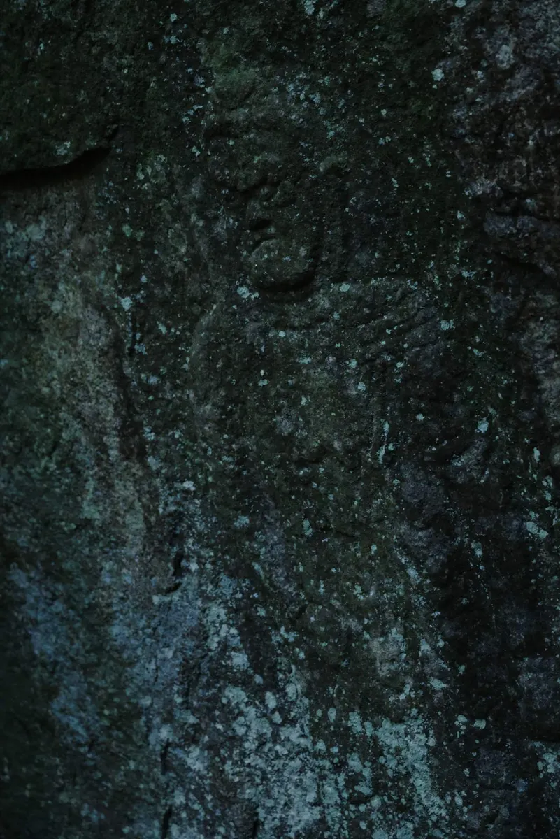 17. わらい仏・眠り仏からは歩くこと10分ほどで、南北朝時代作のからすの壺二尊(阿弥陀・地蔵磨崖仏)に到着です。でも明らかに阿弥陀様しかいらっしゃいません。残るお地蔵様はというと、正面向かって左側に。少し回り込んでみると・・・ いらっしゃいました!