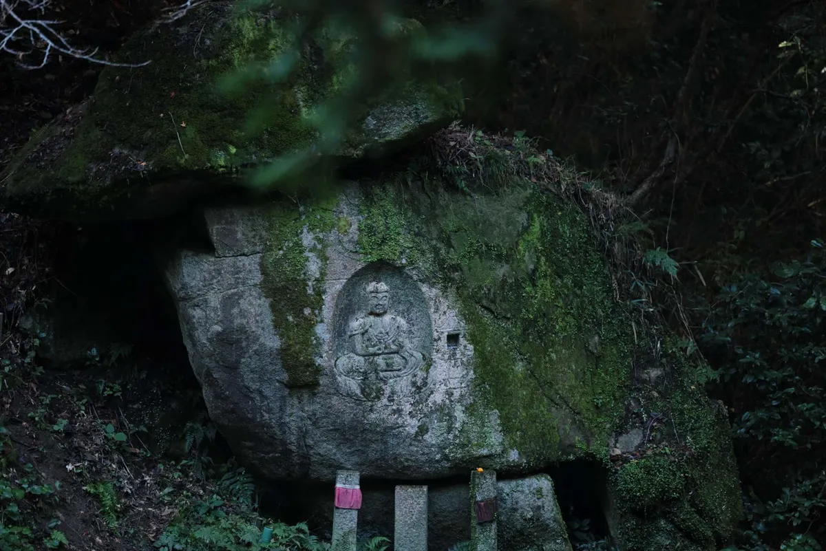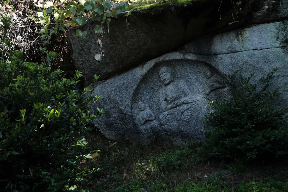 12. 一願不動から歩いて10分ほど、下り坂の先に現れたのは、鎌倉時代作のわらい仏(岩船阿弥陀三尊磨崖仏)。その名の通り、先ほどのお不動さんとは対照的に微笑みを浮かべており、当尾を代表する石仏の1つでアイドル的な存在です。両脇の仏様もどこか柔らかな印象で、ここまでの疲れがじわーっと消えていくような感じさえしました。