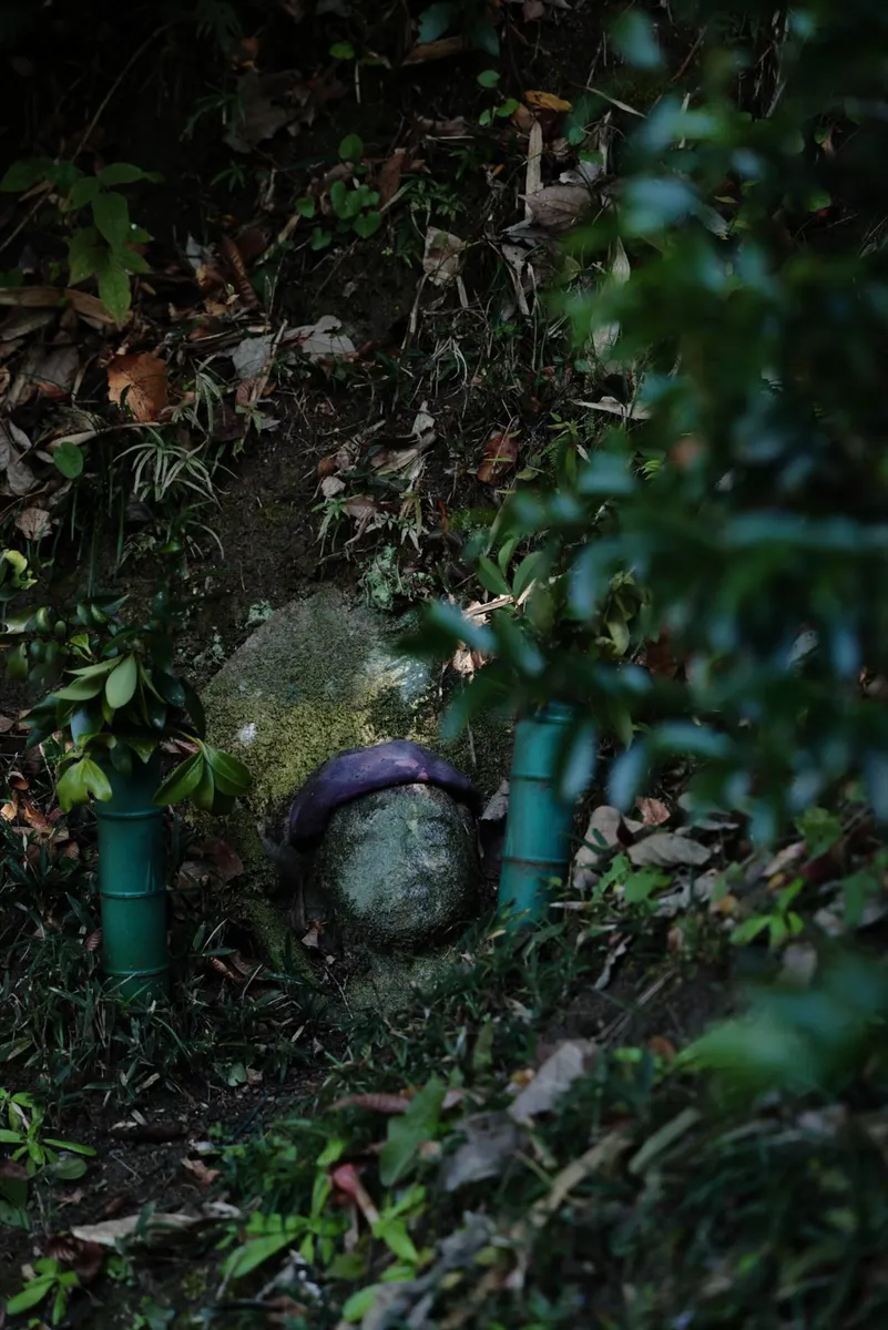 13. わらい仏のすぐ側に、地面から上半身だけを露わした仏様が。その表情や土に埋もれる様子から眠り仏(埋もれ地蔵)と呼ばれますが、手にはしっかりと錫杖を握られています。あえて掘り起こされることなく祀られているそうですが、当尾にはまだまだ未発見の石仏もあるのかなぁ・・・ 。