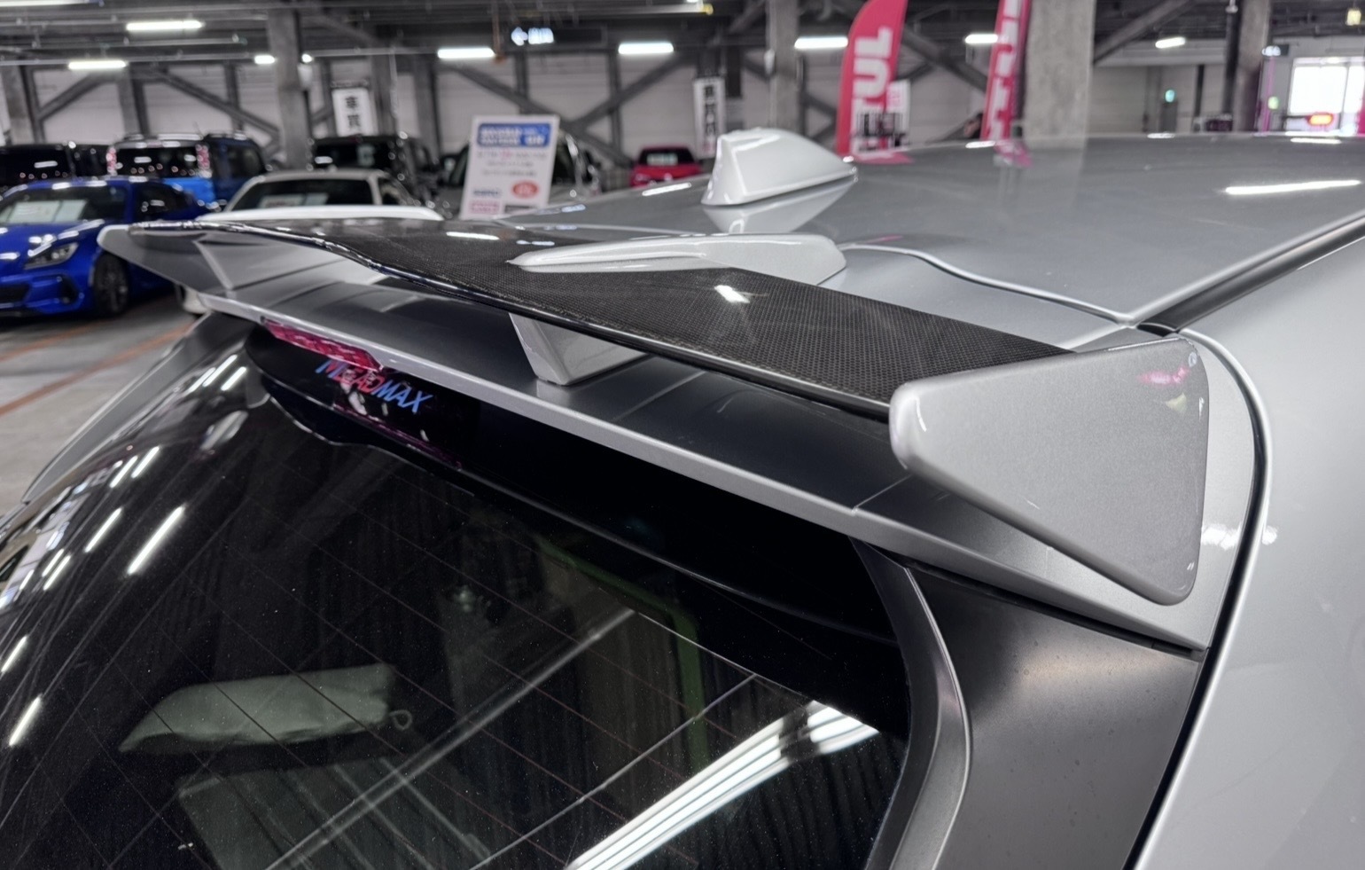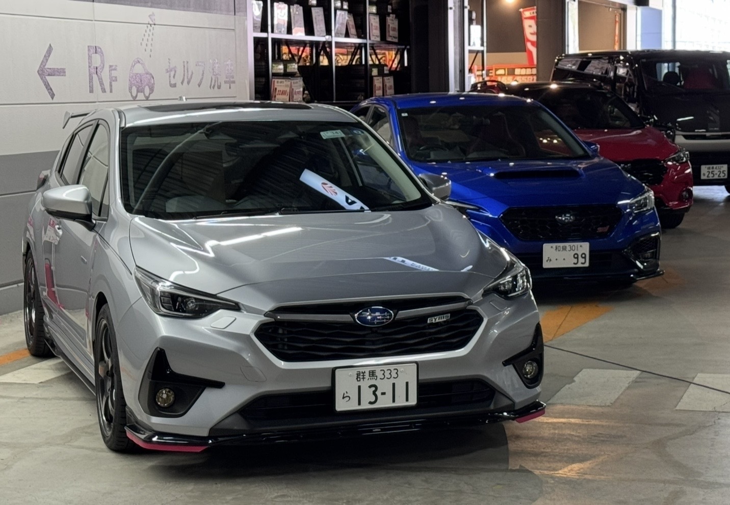 SYMSデモカーのインプには近日発売予定のウイングが取り付けられていました。かなりカッコいいです!しかし私はオプションのデカスポイラーに変えてしまっているので、付けるなら純正スポイラーに戻す必要があり、加えてこれは別途塗装が要るので、変えるハードルはなかなか高い。2年半前にあったら…。