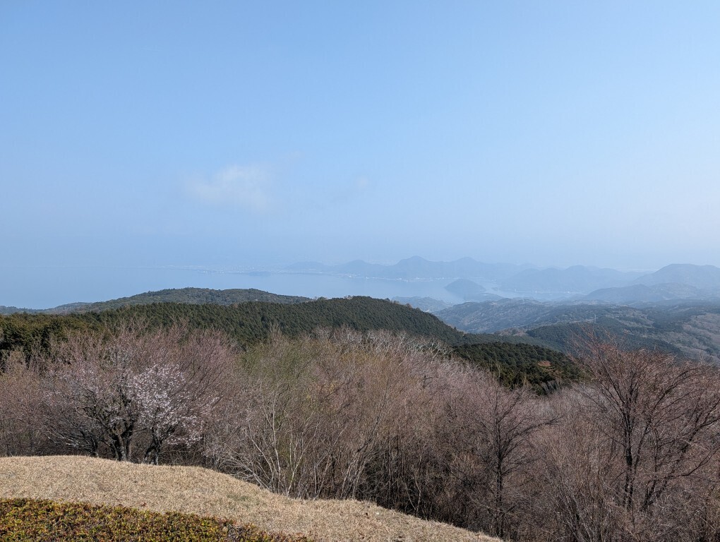 だるま山高原レストハウスの展望台から駿河湾の先に微かに富士山