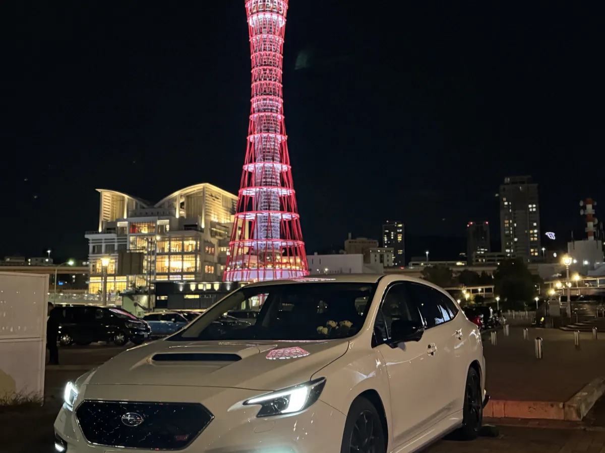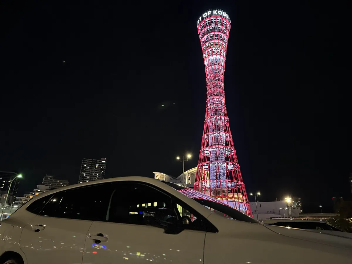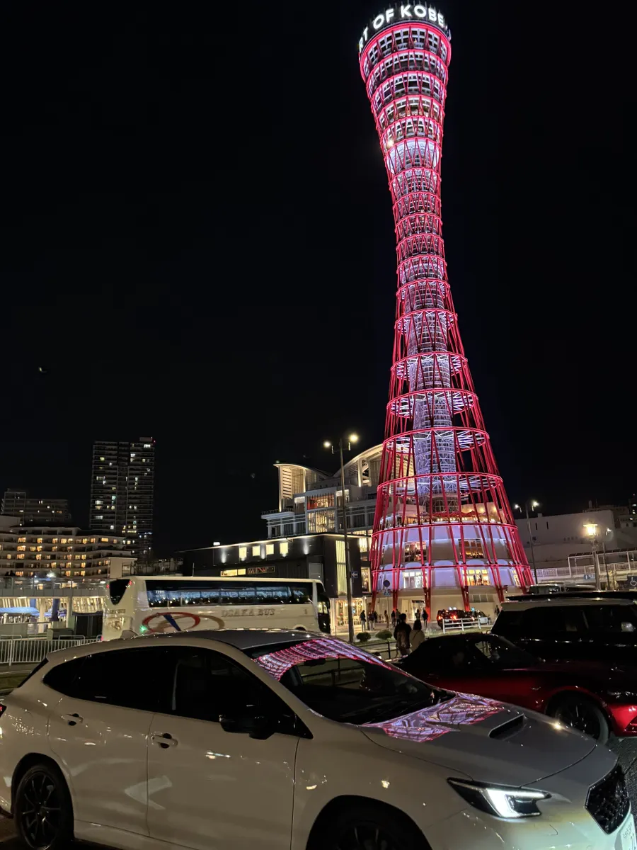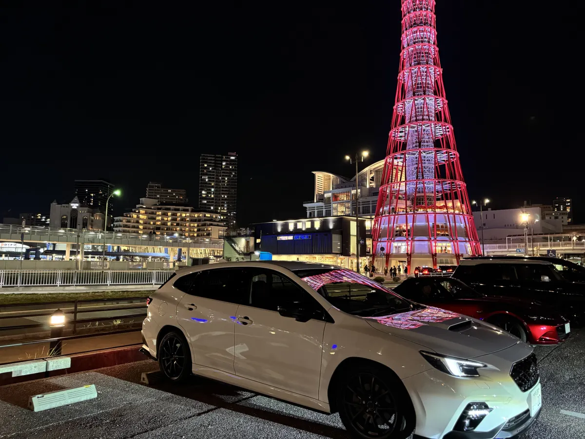 フロントガラスとボンネットに赤いポートタワーが綺麗に映り込みました✨