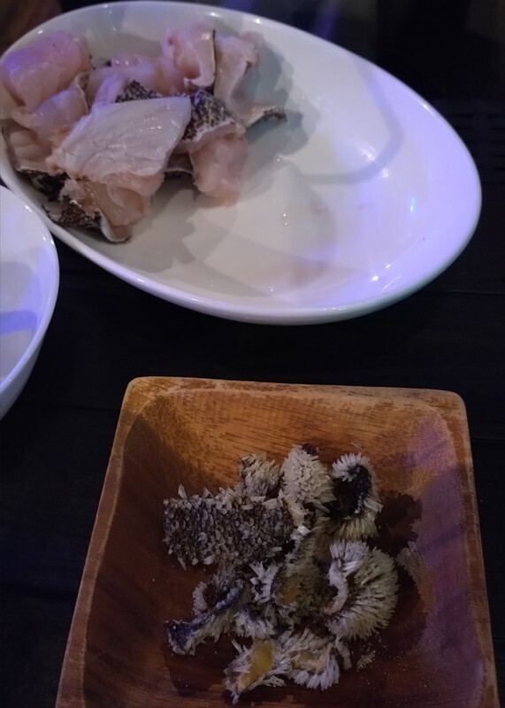 あらを鍋に入れた後のクエ切り身と(確か)ゲソ