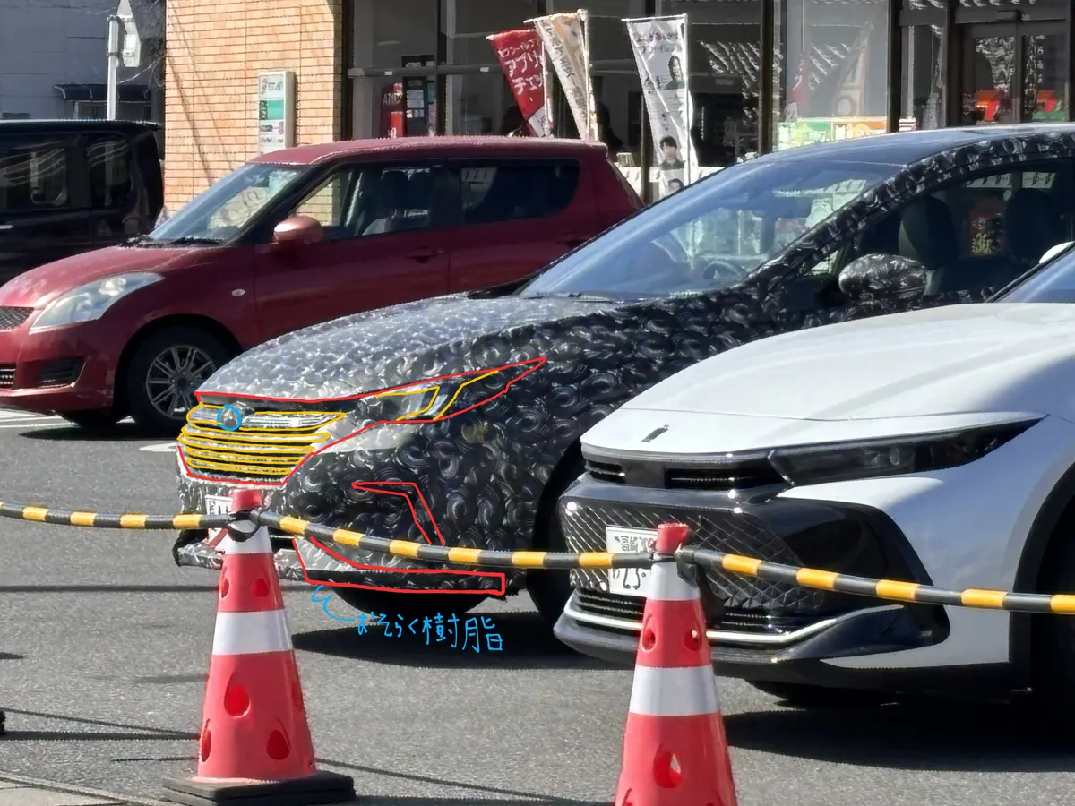 まずはスパイショット画像を分析して、今の時点で分かる意匠に線を引いてみました。これだけでだいぶイメージがつきやすいのではないでしょうか? グリルはレイバックのような大型のものを採用している一方で、バンパー周りはカモフラージュが少し濃く、カラーコーンもありイマイチ分かりませんでした😢