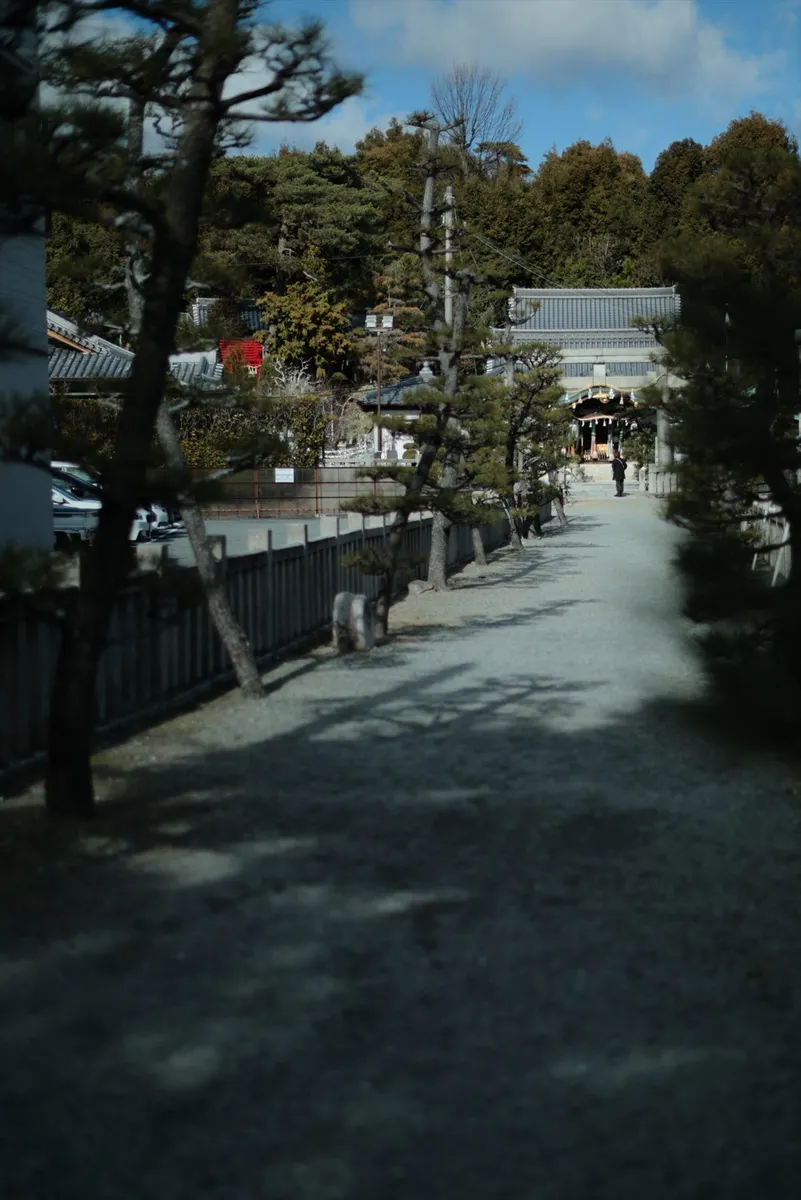 三が日を過ぎた境内は人影も疎らで、静寂に包まれていました。画面右奥の拝殿へと続く砂利道の奥行きを強調。手前の松の枝を暗く落として額縁のように使い、光の当たる拝殿へと視線を導く、クラシックで端正な構図を狙いました。