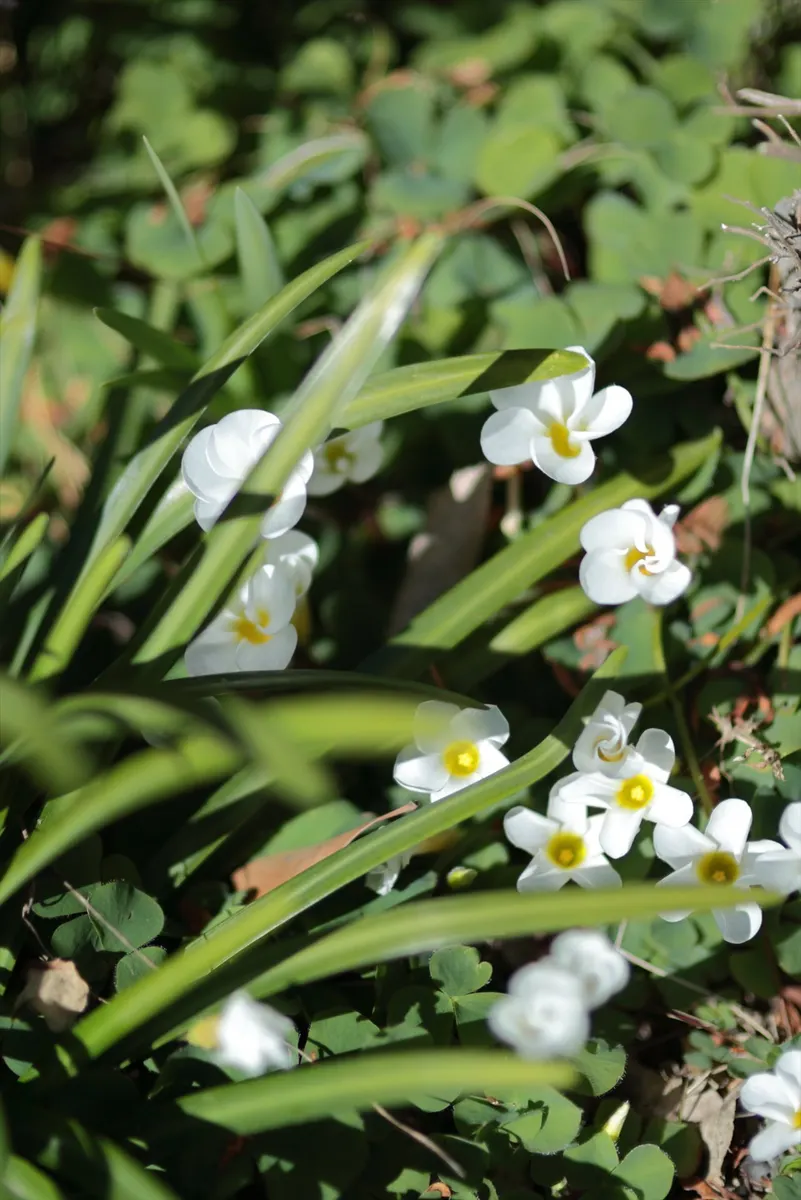 低い位置に咲く白い花を、俯瞰気味に捉えた一枚。葉の影が落ちることで「その場の光の状況」が克明に写し出されました。自然なままの美しさを尊ぶカットです。