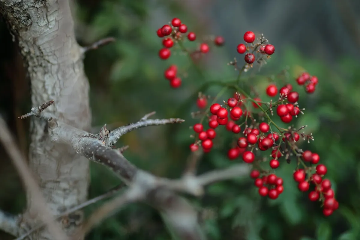 南天の赤い実。あえて主役の実を右側に寄せ、左側に荒々しい樹皮を配置した「静と動」の対比を表現してみました。背景の緑のボケが、赤をより鮮明に引き立ててくれました。