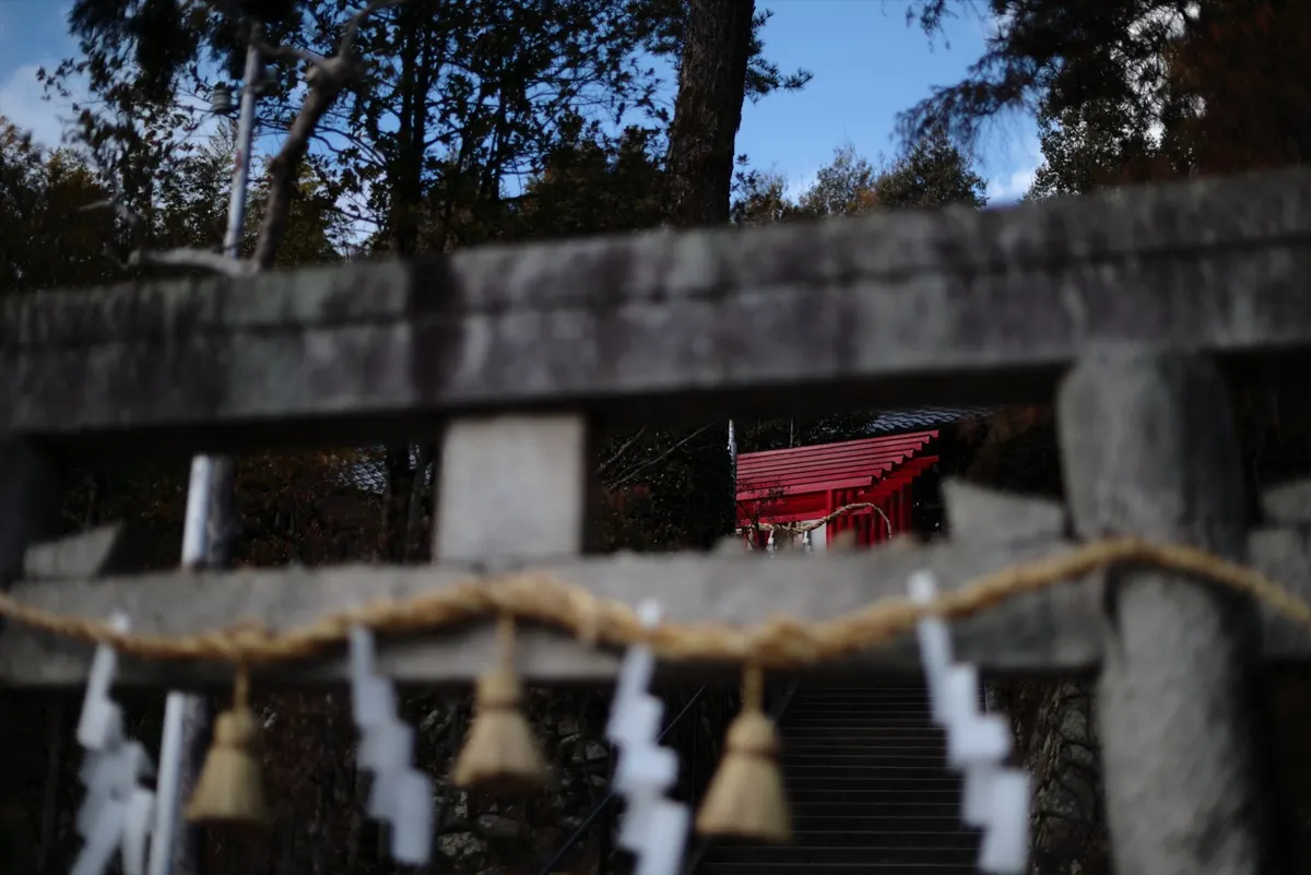 石鳥居の重厚な横一文字を前ボケとして使い、その隙間から奥に鎮座する朱色の社殿を覗き見る構図です。神域の深まりを感じさせる、レイヤーを意識した一枚です。