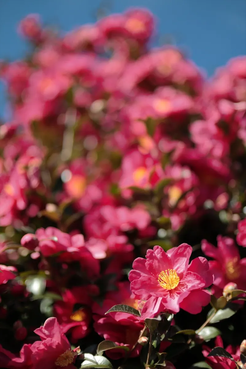 画面いっぱいに広がる鮮やかなピンクのサザンカを、あえて手前の一輪にのみピントを合わせ、背景を大胆にぼかすことで、花の生命力を強調しています。青空とのコントラストを活かし、寒さの中にも確かな春の予感を感じさせる、トップバッターにふさわしい一枚。