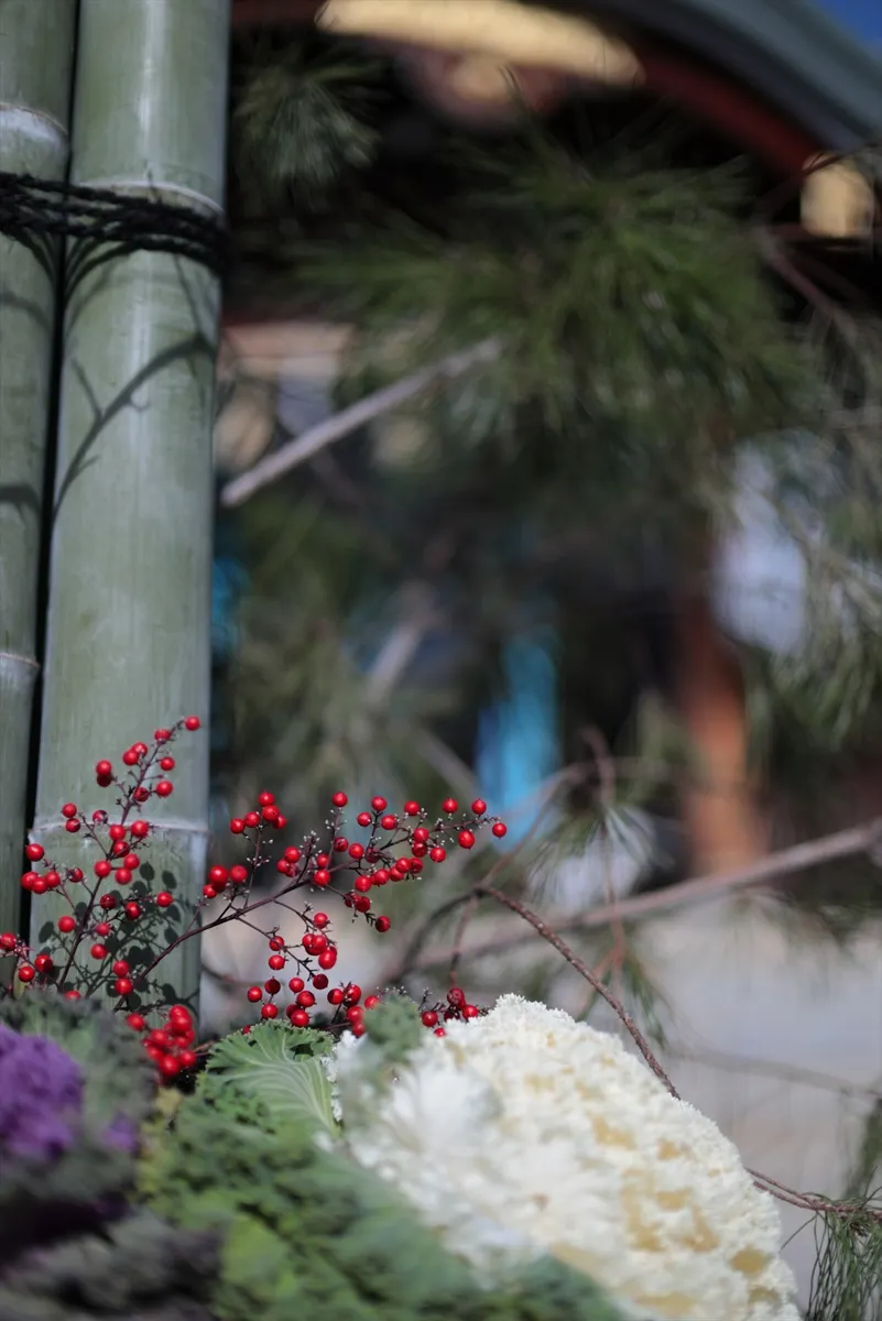 門松に添えられた南天の赤と葉牡丹の白。垂直に伸びる竹のラインを左側に配置し、背景の拝殿を大胆にぼかすことで、正月の縁起物が持つ鮮やかな色彩と質感を浮き彫りにしました。