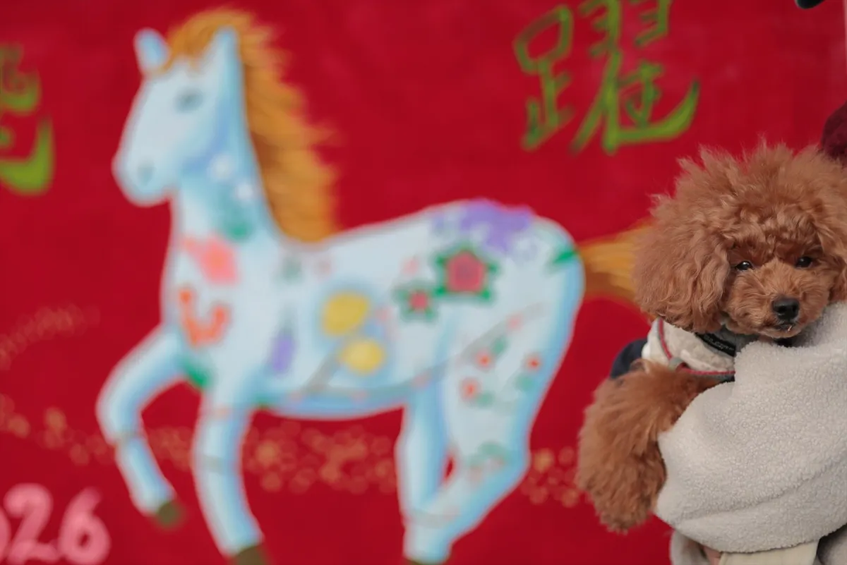 力強い干支の絵馬と「飛躍」の文字を背景に、大切な家族であるBEBEを抱き上げ、新しい一年の幕開けを記録しました。