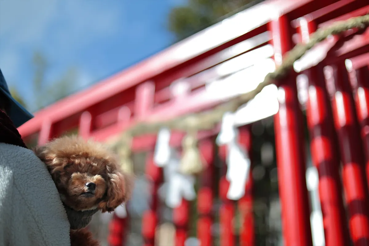 抱っこされたBEBEの穏やかな表情をクローズアップ。背後に広がる朱塗りの鳥居を、光の粒のようなボケとして処理することで、新春の暖かな空気感とともに愛犬を優しく包み込みました。