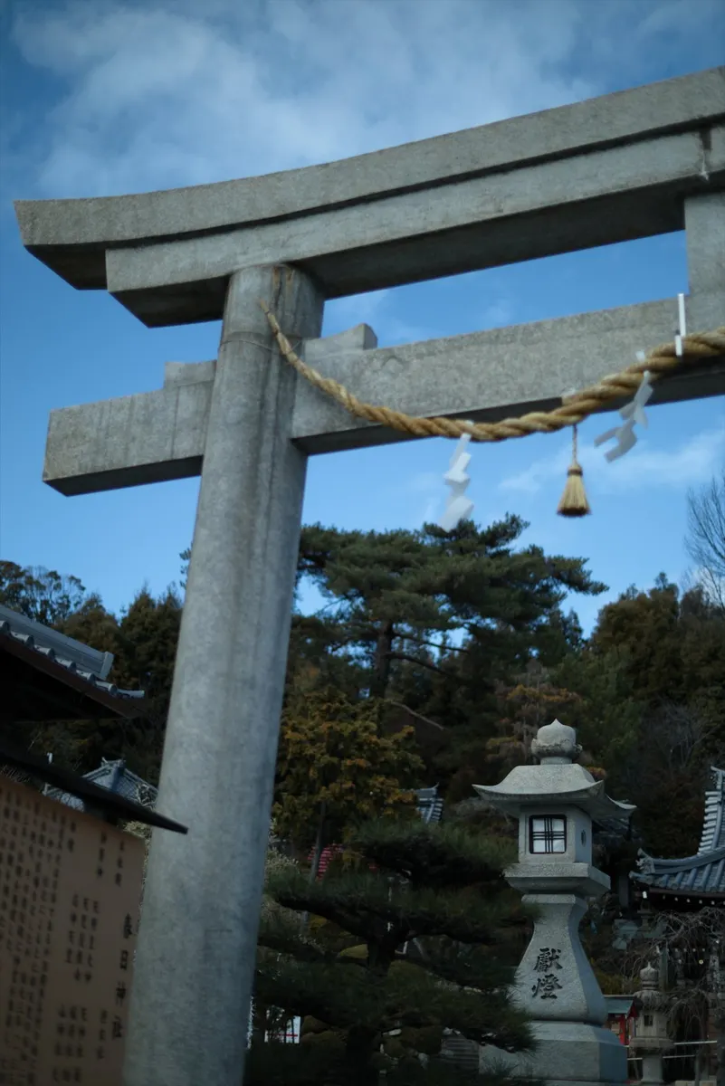石鳥居の重厚な質感と、透き通るような青空の対比。あえて下から見上げるアングルで、石灯籠や木々の高さを際立たせ、神域の持つ「垂直方向の広がり」を意識しました。
