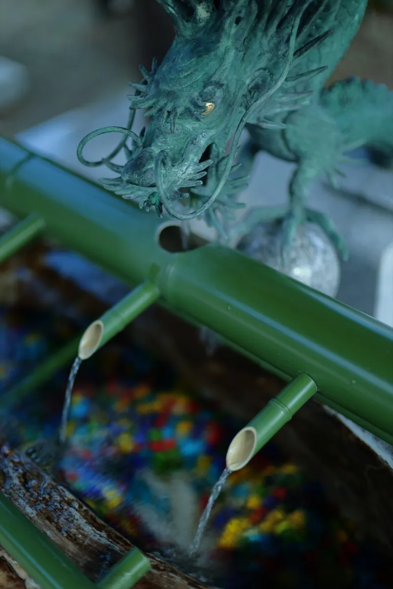 竹の緑、龍の青銅色、そして底に沈む色とりどりの石。多色な被写体を、龍の瞳にピントを絞ることで引き締めました。冷ややかな水の流れが、心身を清めてくれるようでした。