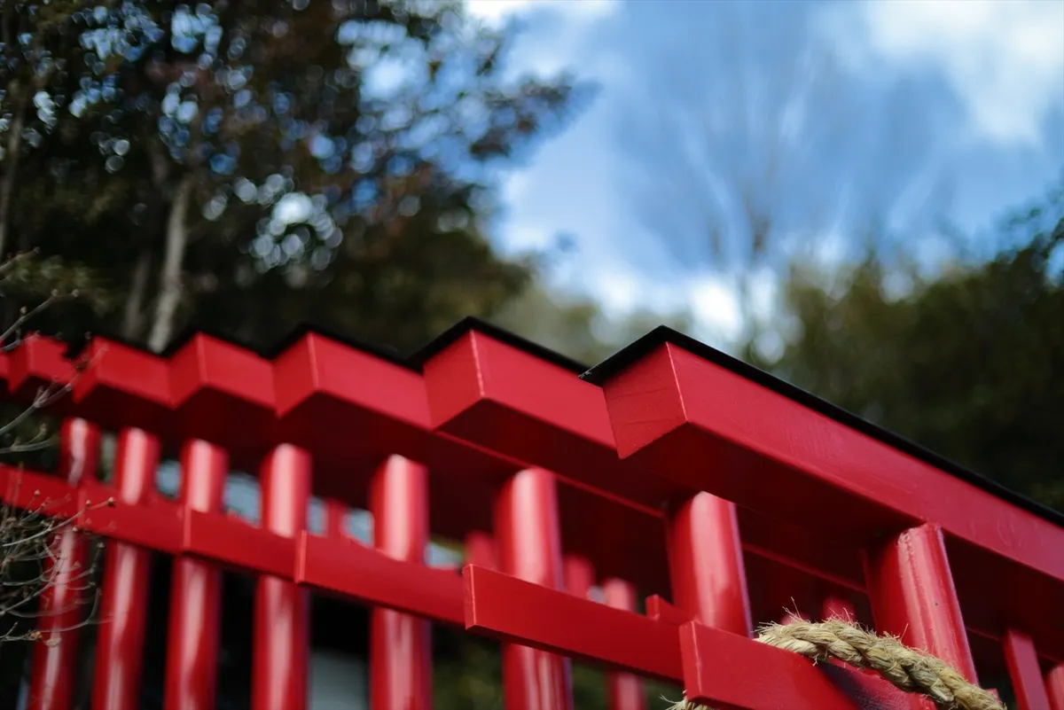 連続する鳥居の笠木を、斜めのラインで切り取りました。規則正しい構造美と、冬の澄んだ青空への抜け感を強調したグラフィカルな視点の一枚です。