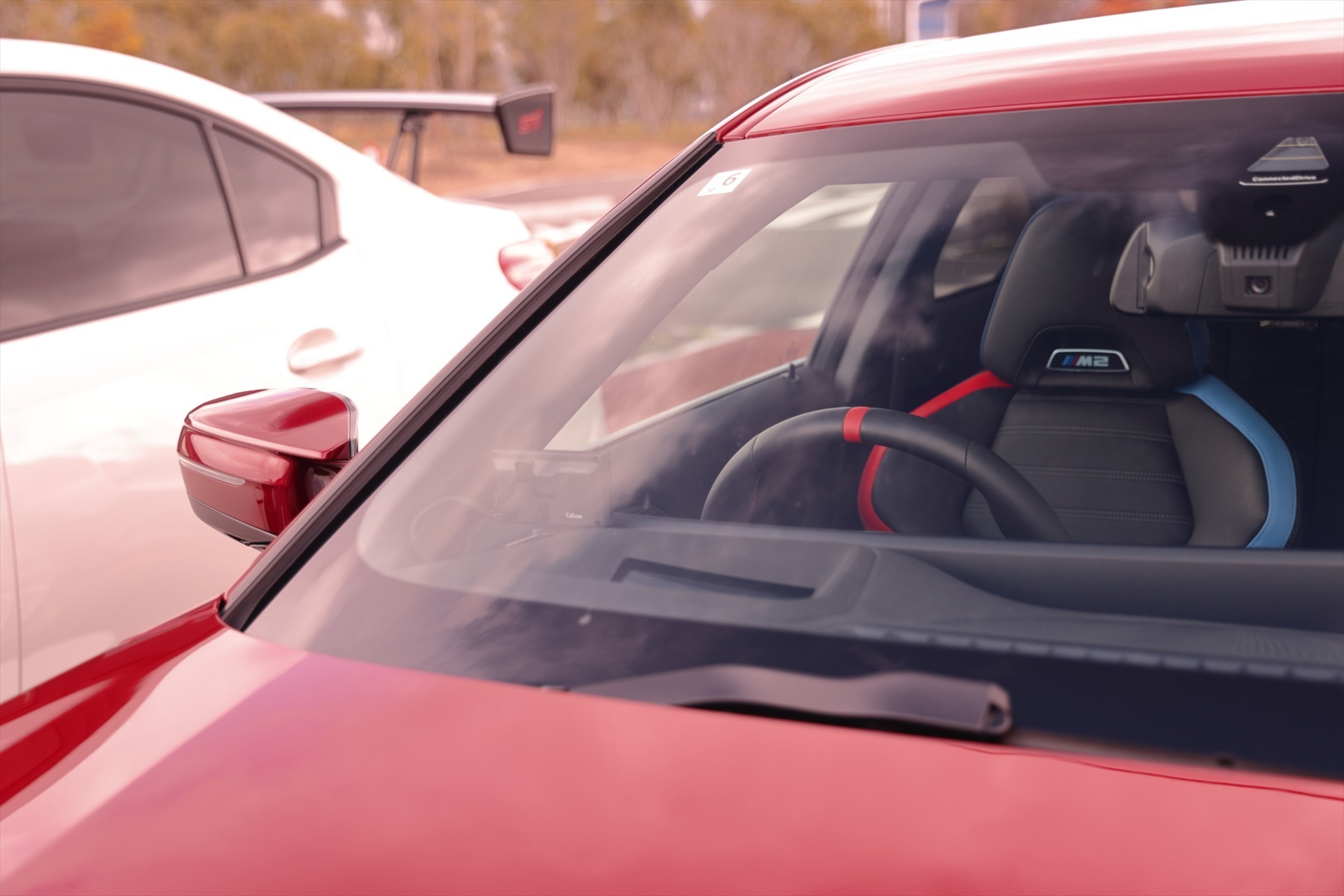 6. PLフイルターでフロントガラスの映り込みを消して、M2の内装も撮影してみました。赤と青の挿し色の皮革製シートがめっちゃかっこいい!ステアリングにもセンターマークが入ってます!なんとステアリングヒーター付き!