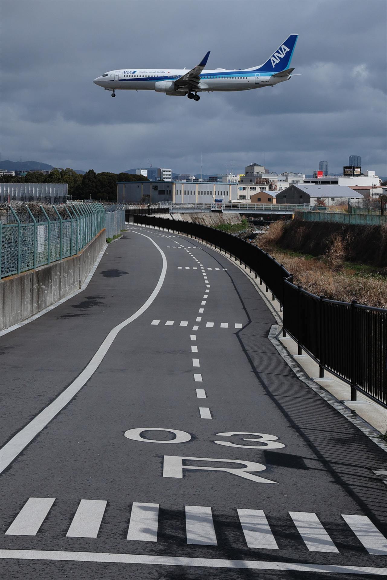 10. 続いて千里川土手に移動。土手沿いに描かれた「03R」と飛行機を絡めて撮るのが新しい定番構図ですね。飛行機がどのくらいの高さで降りてくるのかわからないので、後からめっちゃトリミングしています(笑)。