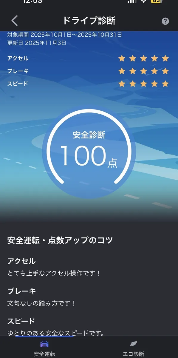 すべて5つ星⭐️ですね。安全運転かつエコ運転!このような良い診断結果が届くと嬉しいですね☺️やはり日頃の運転が反映するのですね。