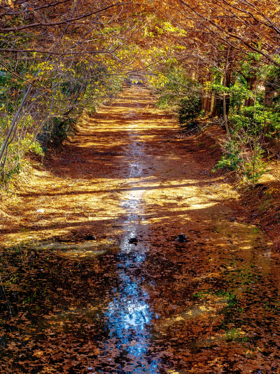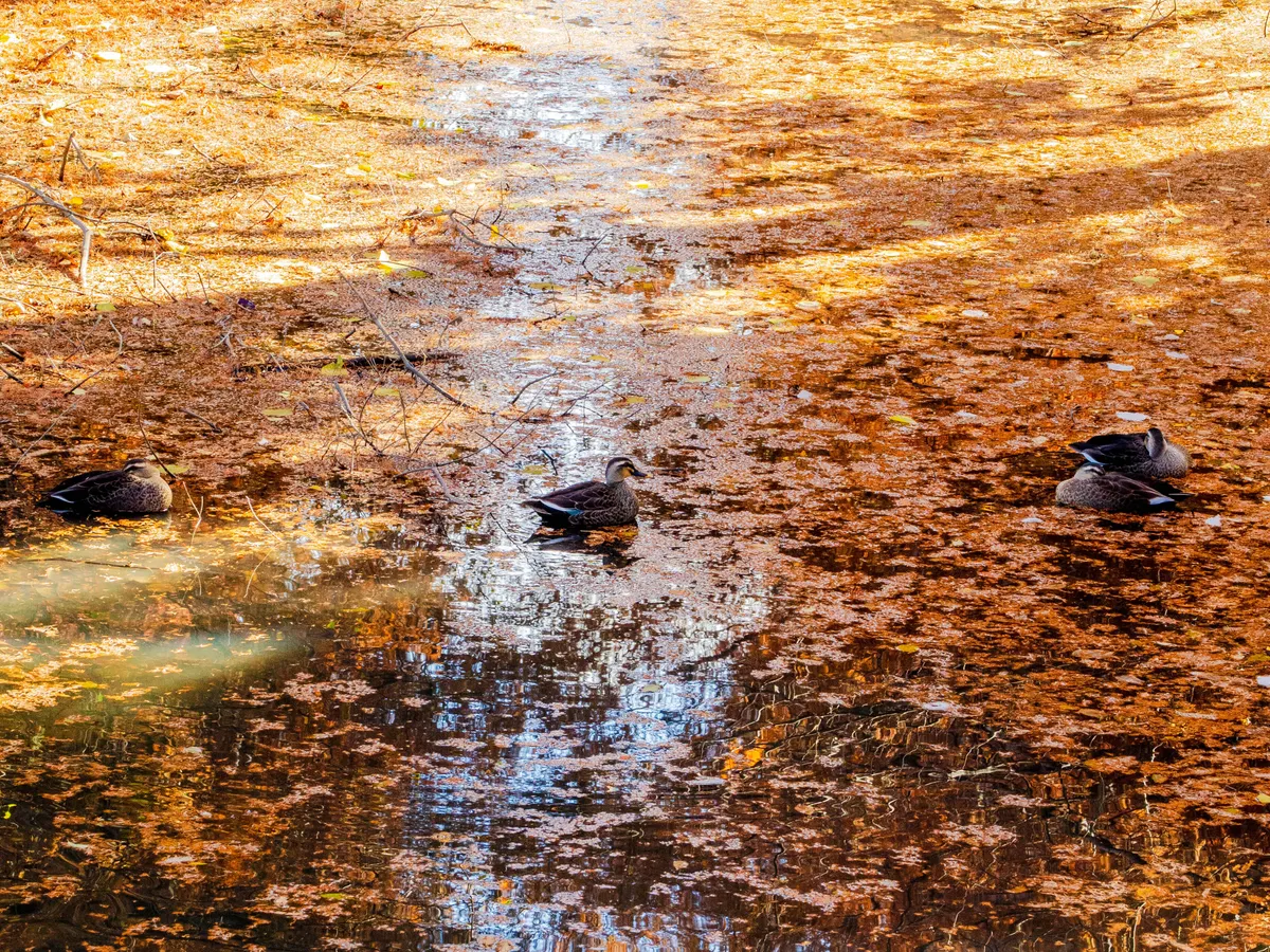 水路の落ち葉の布団で休んでるのかな、可愛いです🦆