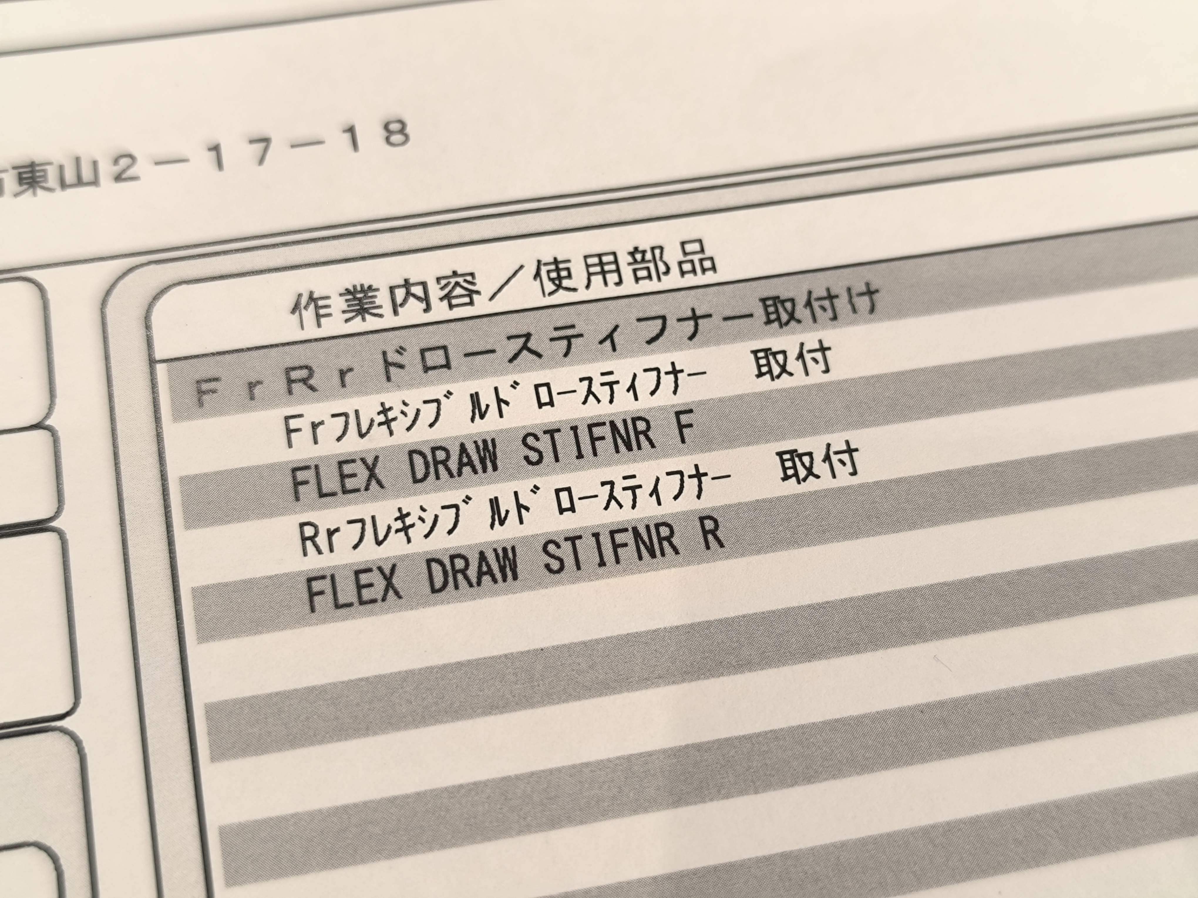 昨日1年点検でディーラーに行き、滑り込みでフレキシブルドロースティフナーフロント、リア注文。(先行して発注はしてもらってましたが)