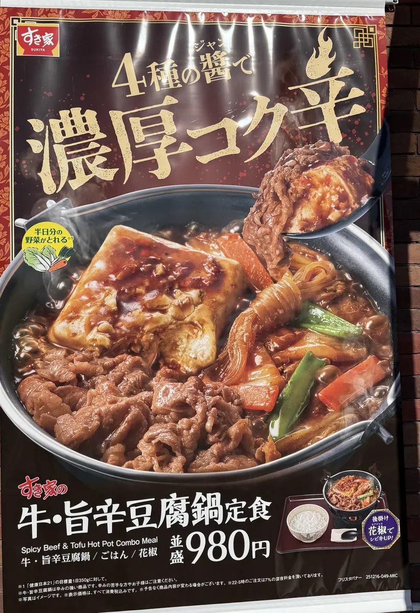 先日すき家の前を通りかかった際に偶然目に入った「牛・旨辛豆腐鍋定食」の旗🚩