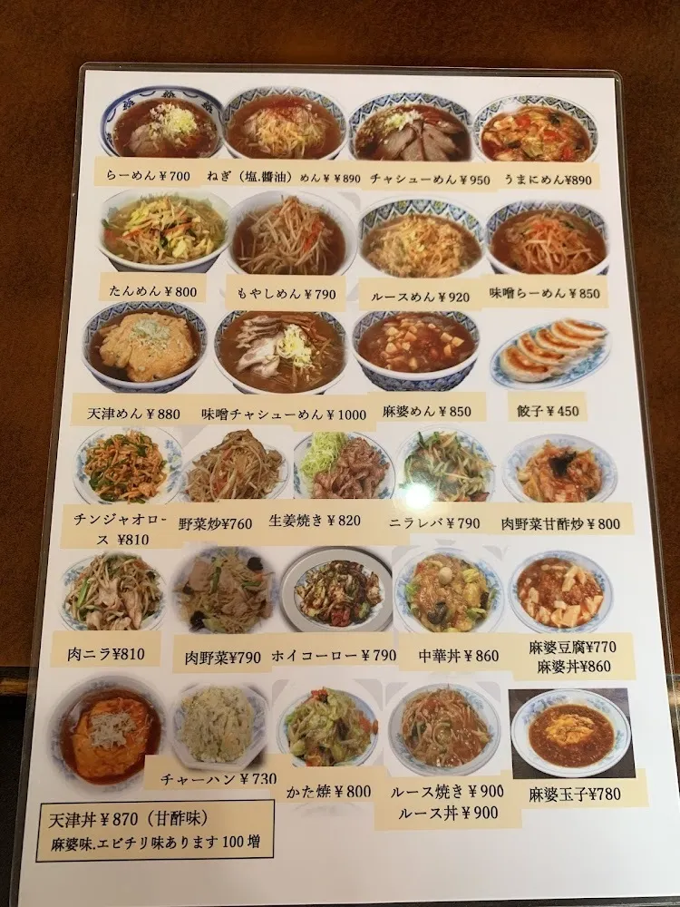 主なメニューは↓です。裏面にはおつまみ、ビールなど飲み物が書かれてます。大体の品物は食べましたが、チャーシューメン&チャーハン、麻婆丼、餃子が好きです。価格は昔からずっと変わらずで、1000円を超える品物はないです。