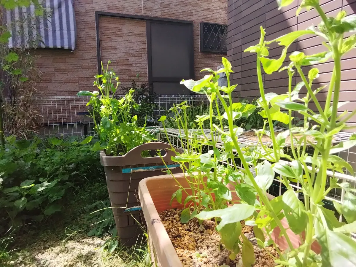 そうだ、バジルくんを摘んでカマキリには青紫蘇へ移動してもらおう。