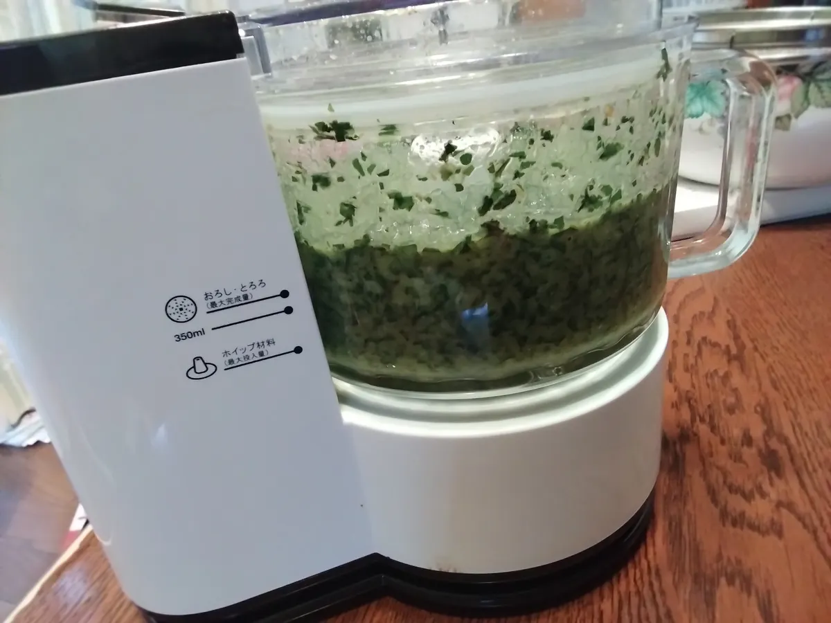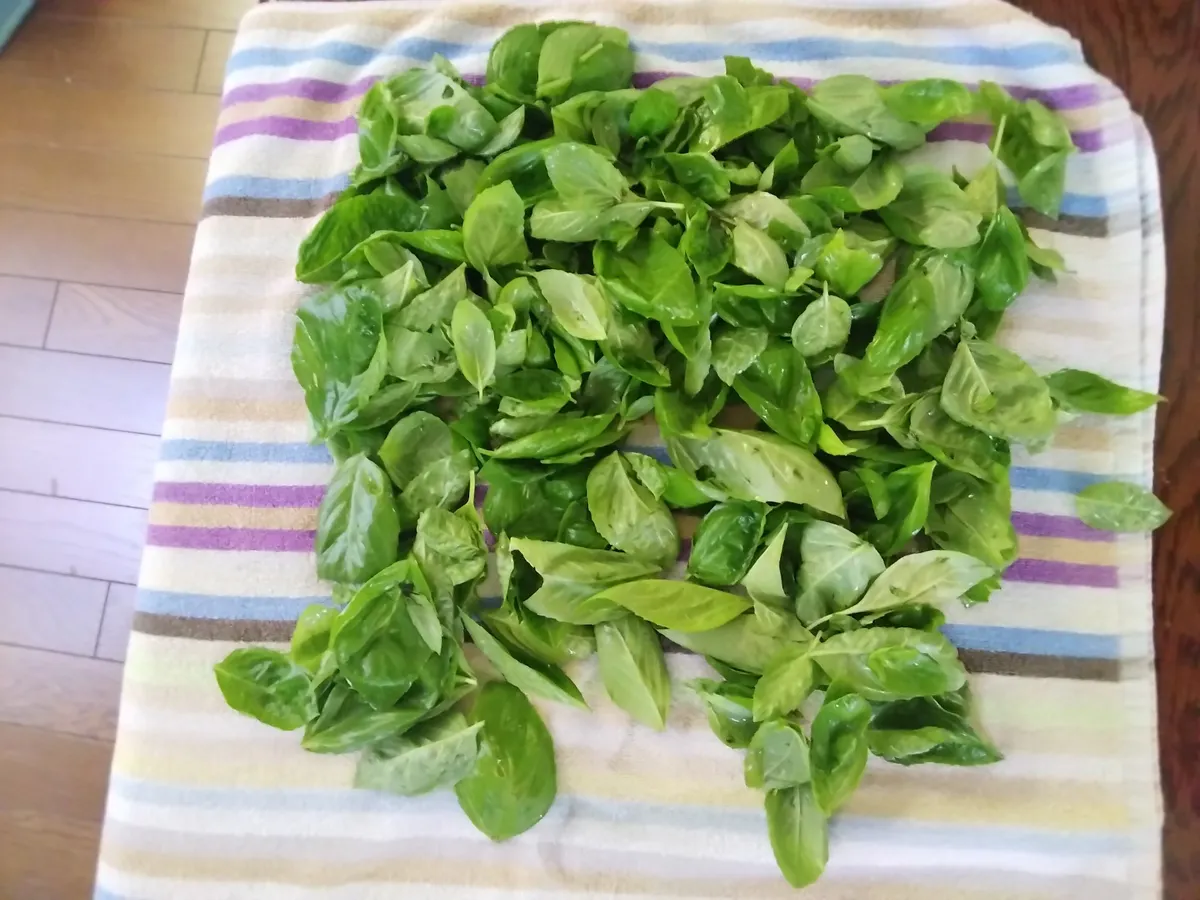 で、写真のバジルくんの葉でバジルソースを作ります。