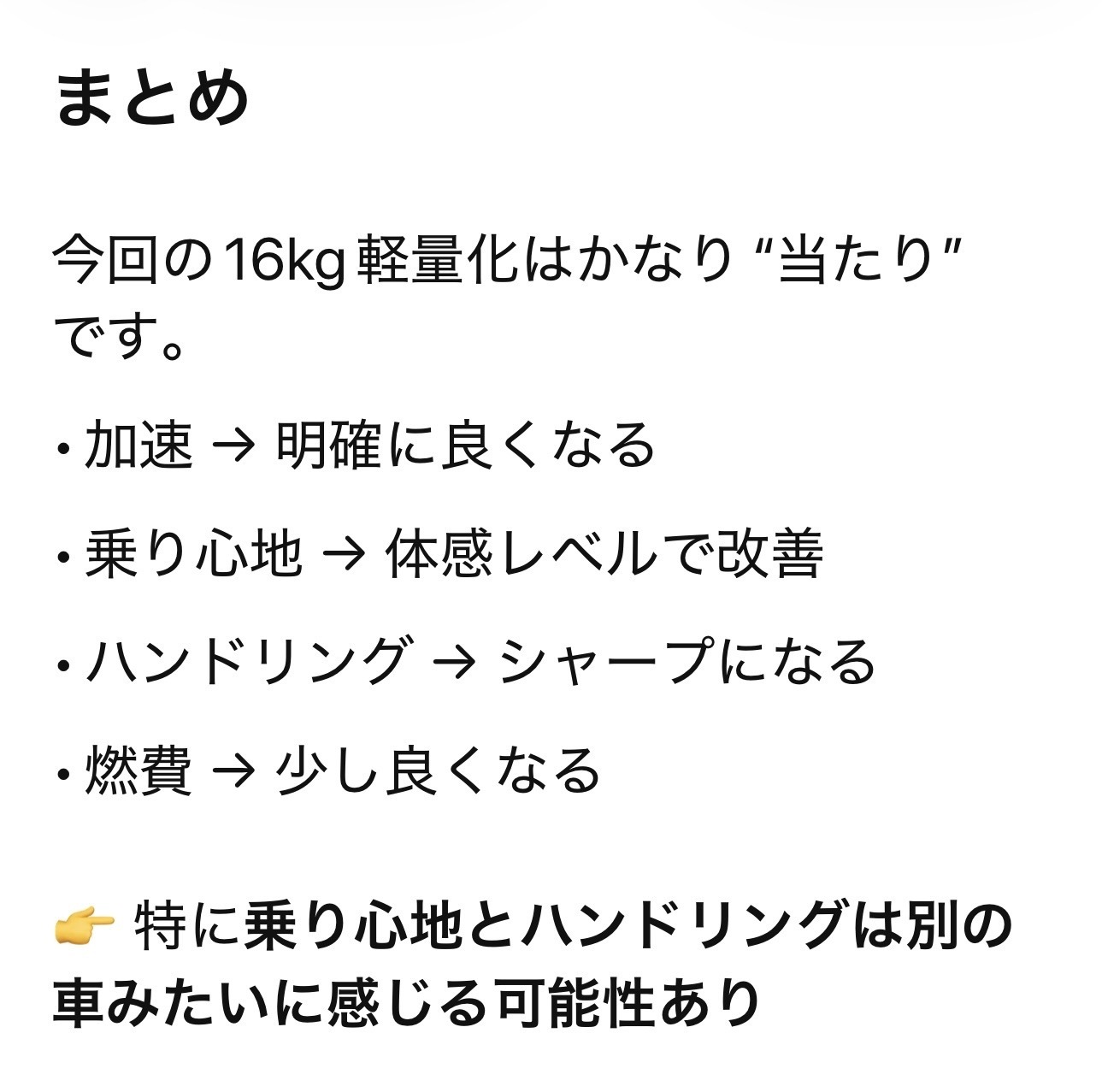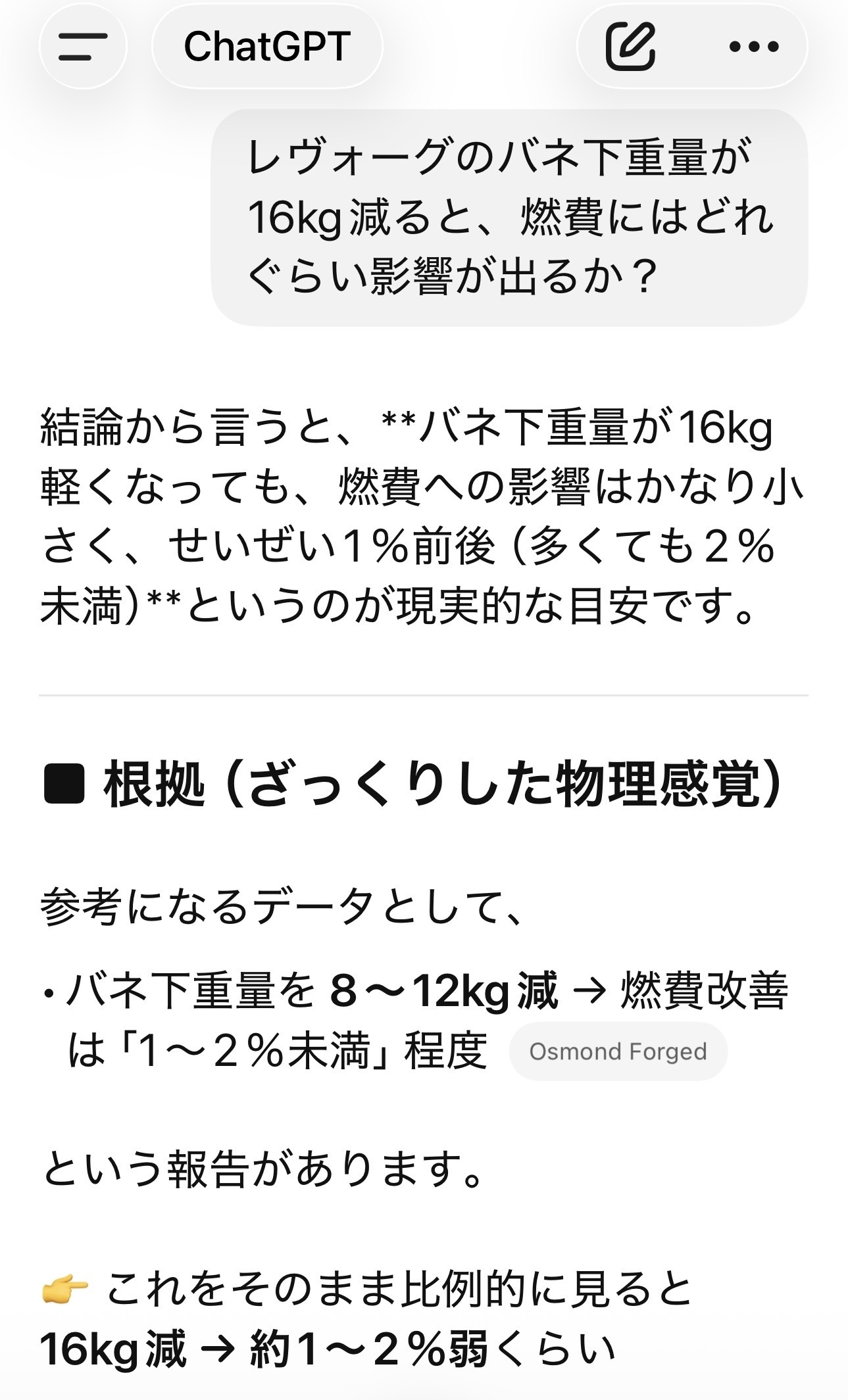 我が家のVNレヴォーグのホイールをBBSに替え、バネ下重量を16kg軽量化したので、どんな影響があるかチャッピーに聞いてみました♪