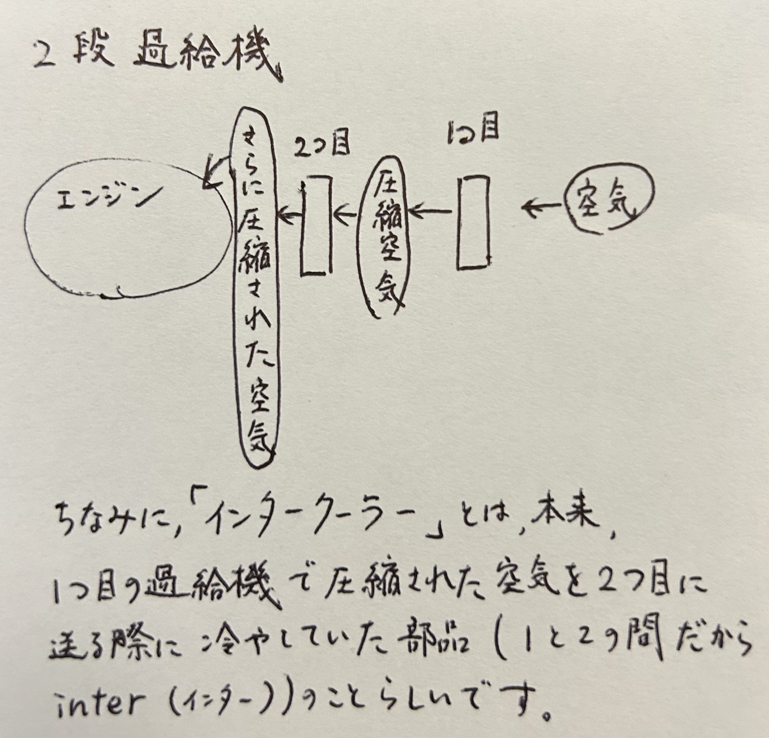 2段過給機とは•••飛行機のレシプロエンジンに過給機が一つだけだと、飛行高度が高くなるにつれてエンジンの馬力が出にくくなります。2段過給機とは、それを防ぐために、過給機を2つ連結し、1つ目で圧縮した空気を2つ目でさらに圧縮するという仕組みです。(扇風機では、出てくる風が強く、真っ直ぐになってくれます。よく冷えそうです。)