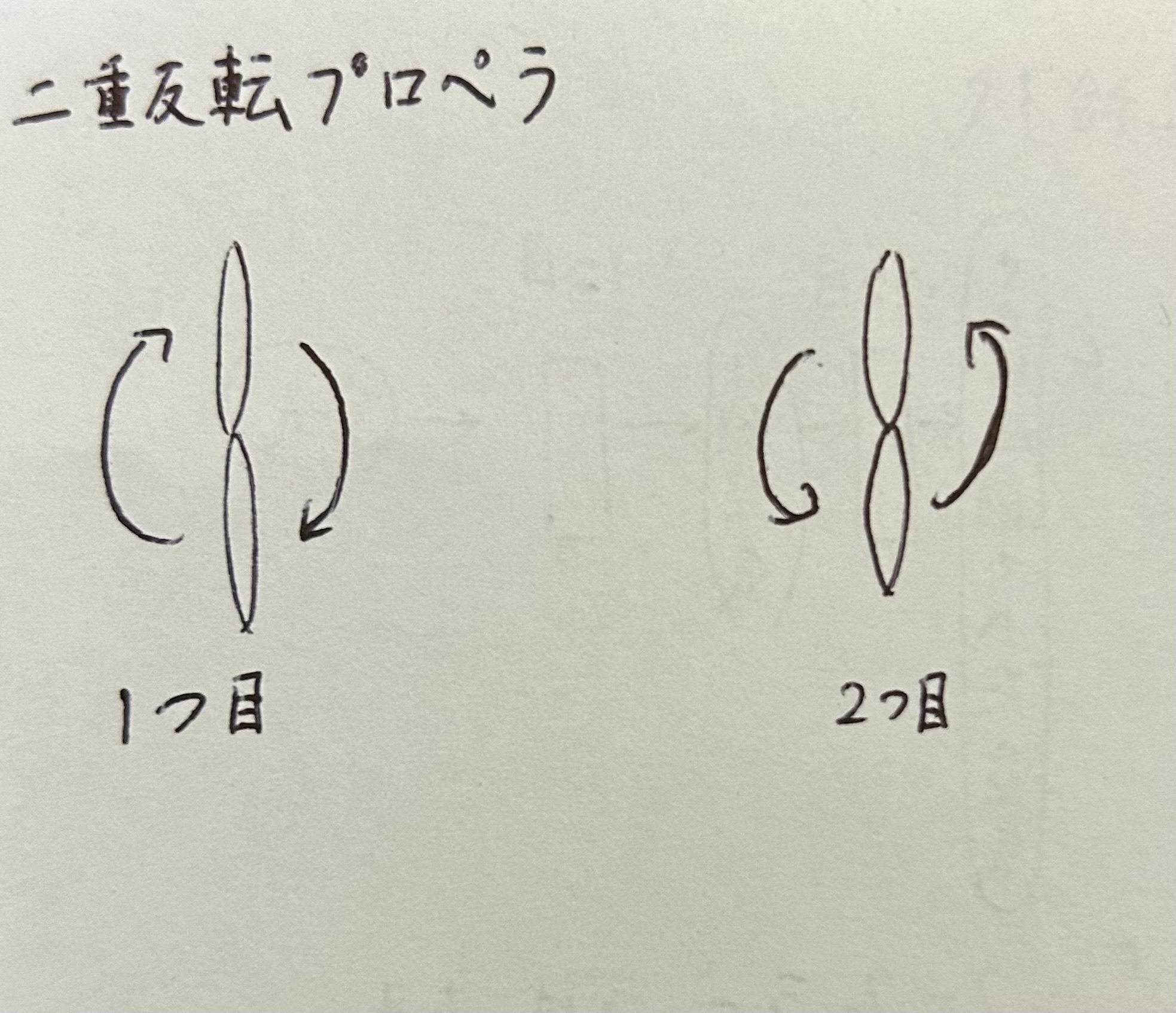 二重反転プロペラとは•••水平対向エンジンが互いの振動を打ち消し合うように、プロペラも、等速で逆回転すると互いのトルクを打ち消し合うことができます。こうすると、飛行機の進行方向をスムーズに変えることができます。この扇風機でも、飛行機が離陸するような感じの動きをしても、左右に振られないです。