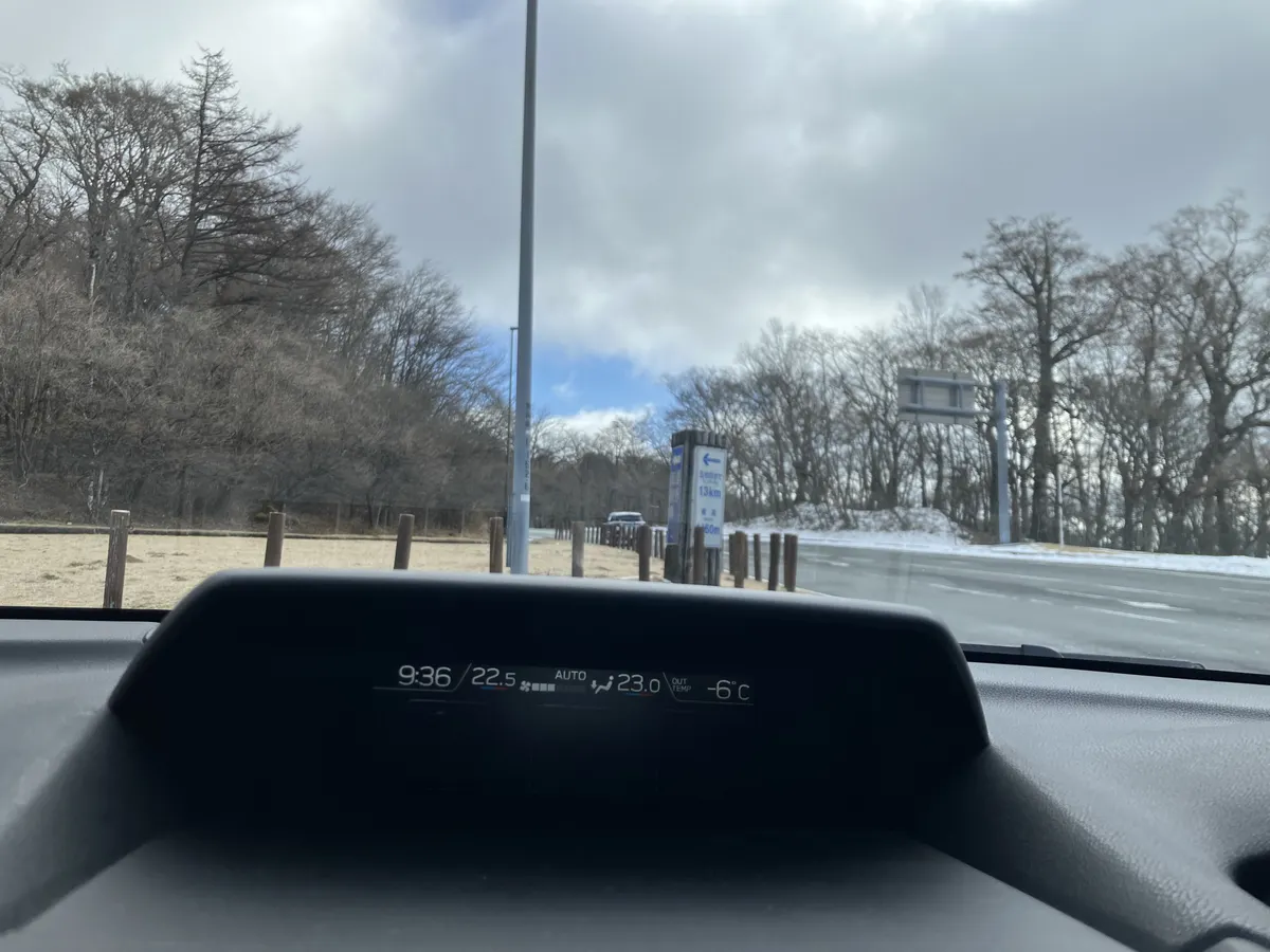 途中から道路脇にユキが現れてきました。富士山スカイラインに入ってから積雪も増えてきましたが路面にはユキも無く走行に支障はありません。富士宮口の分岐付近の外気温は -6℃ でした。🥶