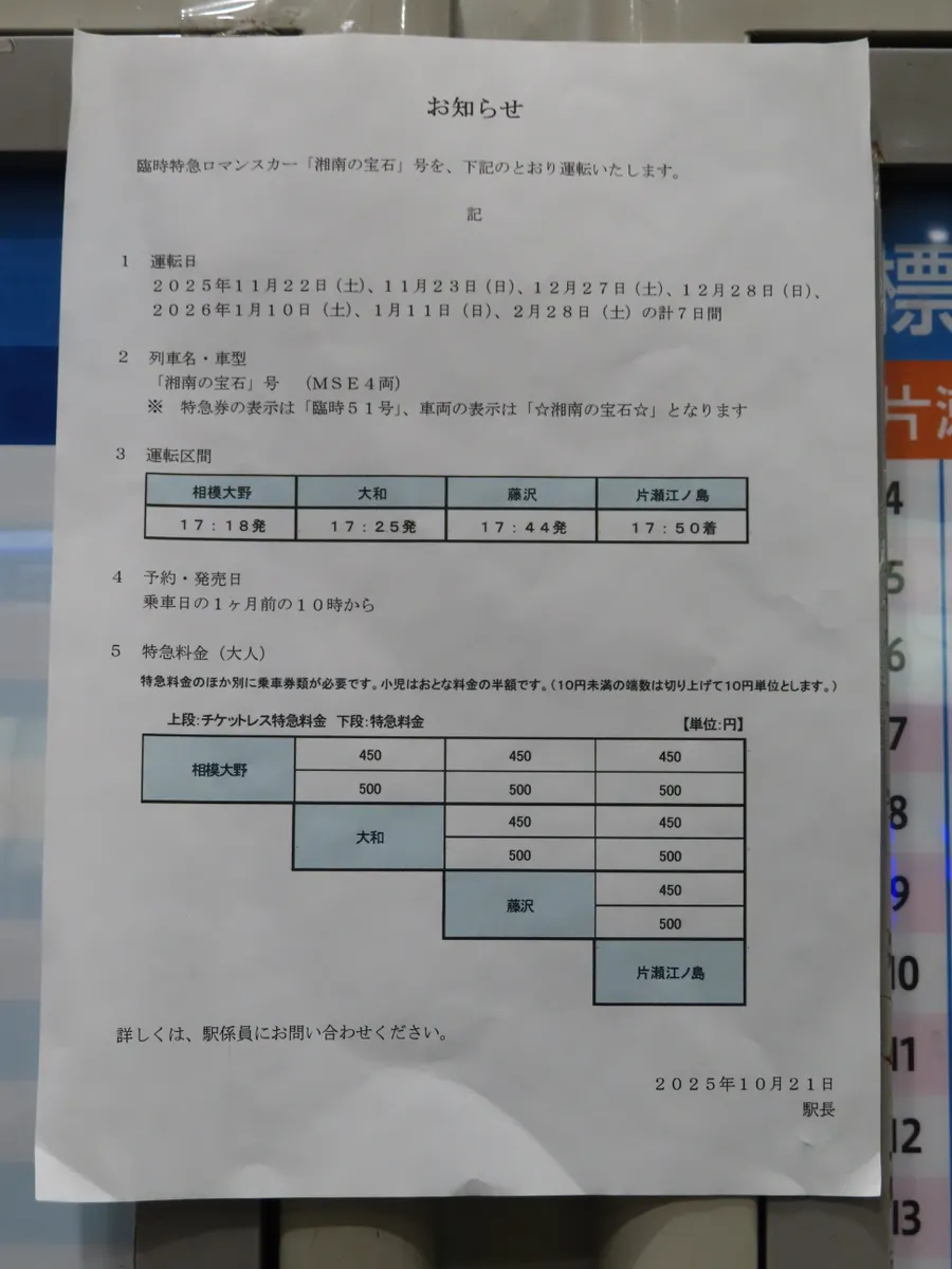 臨時特急湘南の宝石の特急料金と運用ダイヤ