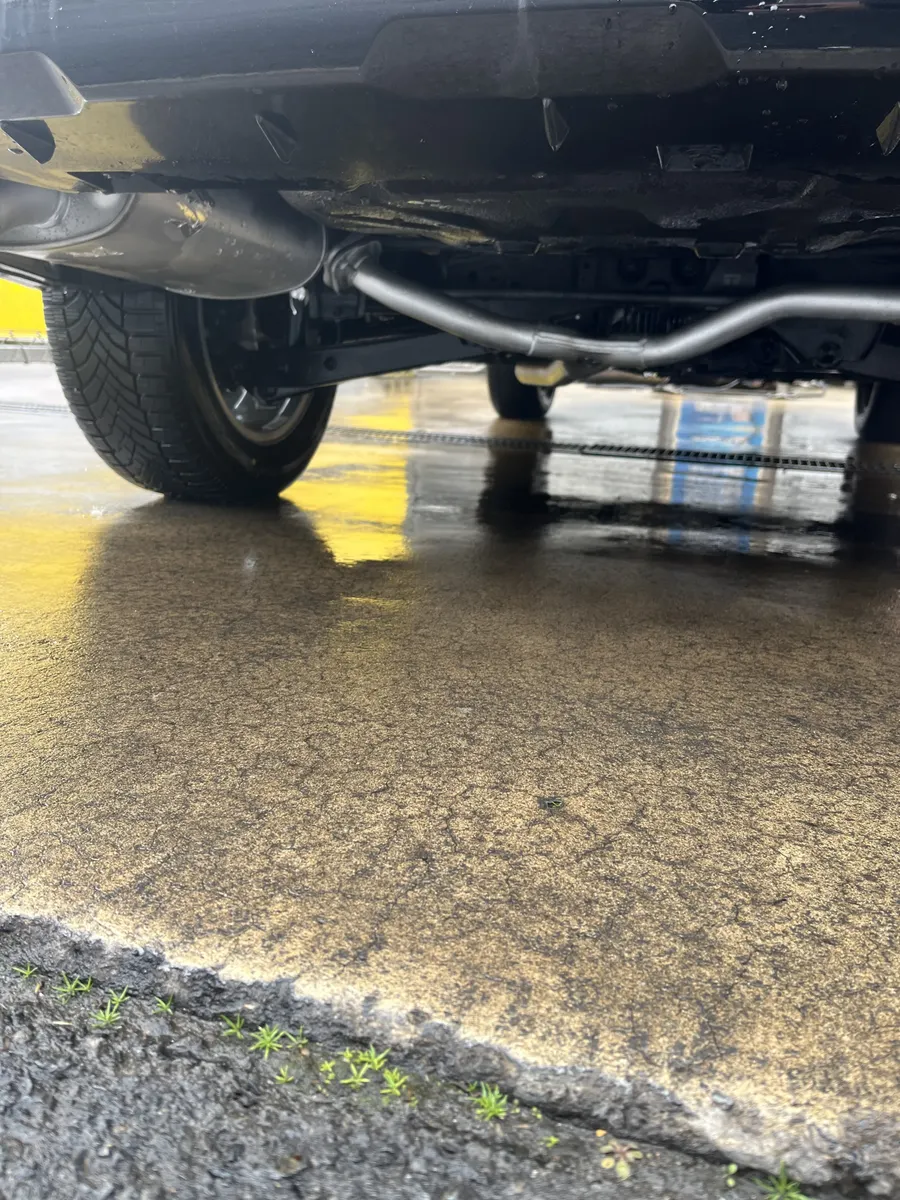 遠出した際は、コイン洗車場のジェットガンで下回りだけ洗います。ボンネットをあけてるのは、この時遠出から戻ってきたばかりで排気系に熱が残っており、そのまま水をかけるとパイプが痛みやすくなる(急激な熱変化で変形しかねない)ので、なるはやで冷やそうと思ったためです。とある平日午前の雨上がりということもあり人はゼロでしたので、この状態で20分ほど放置してから洗浄にはいりました。