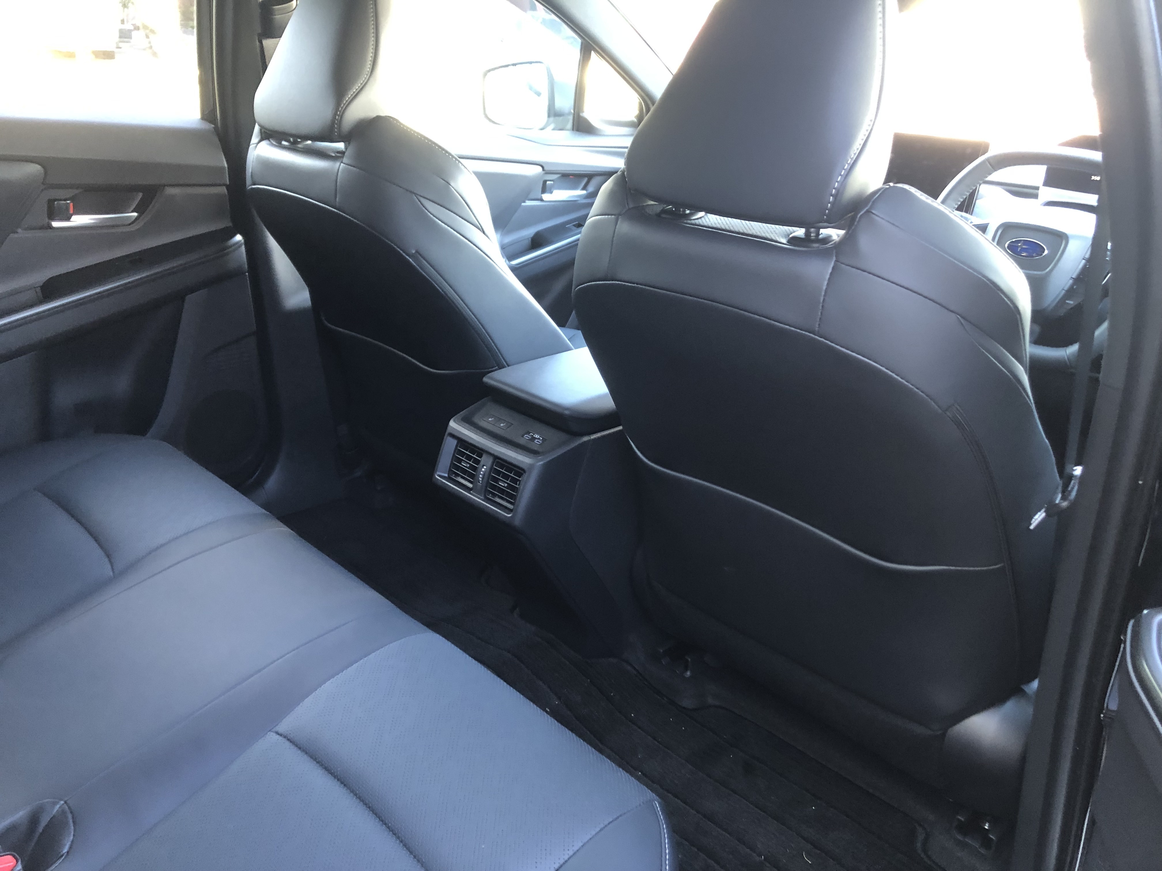内装と前席は概ね新型ソルテラと同じに見えました。ただ、ステアリングホイールはソルテラと違って丸型なので、シートポジションによってはメーターが見にくいかもしれませんね。写真は撮りませんでしたが、後方視界は広くスバルらしいと感じました。