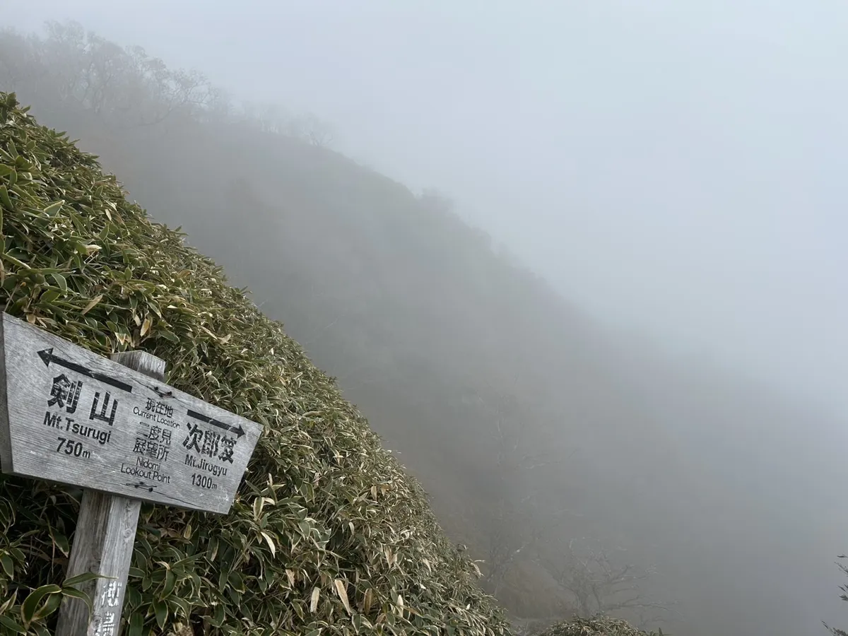 途中は汗だくでしたが頂上に近づく程に寒くなり、頂上では霧と風で