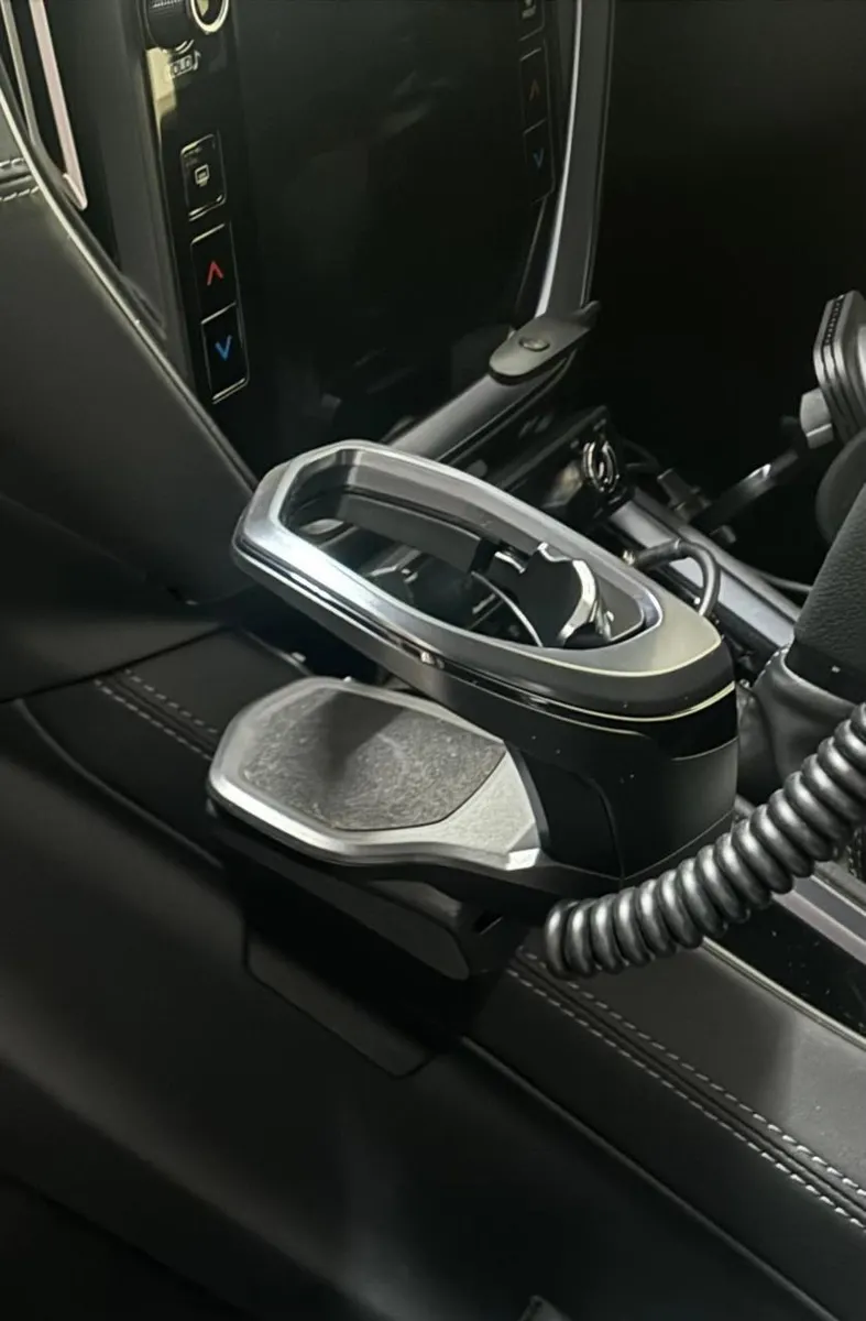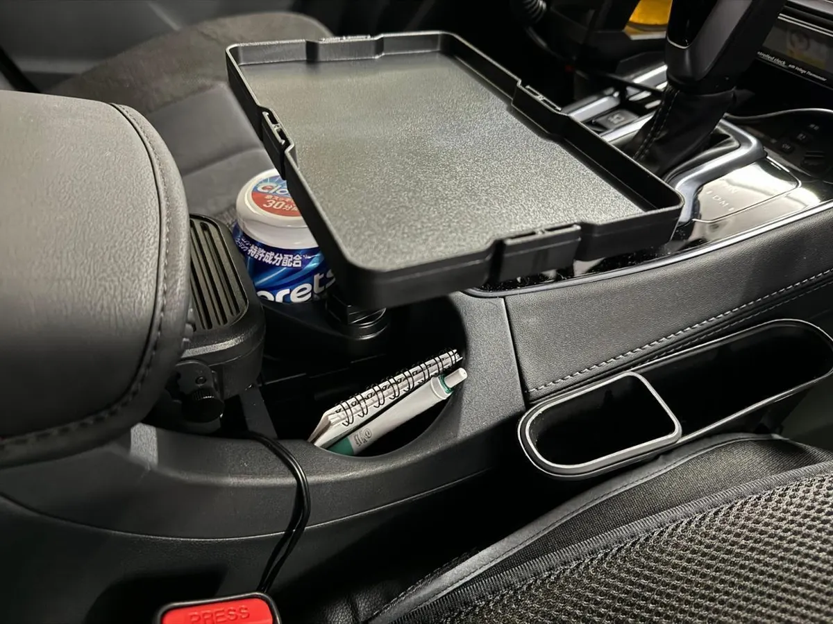 そこで、センターコンソールのドリンクホルダーを使い、「槌屋ヤック マルチトレイテーブルZE68」を設置しました。