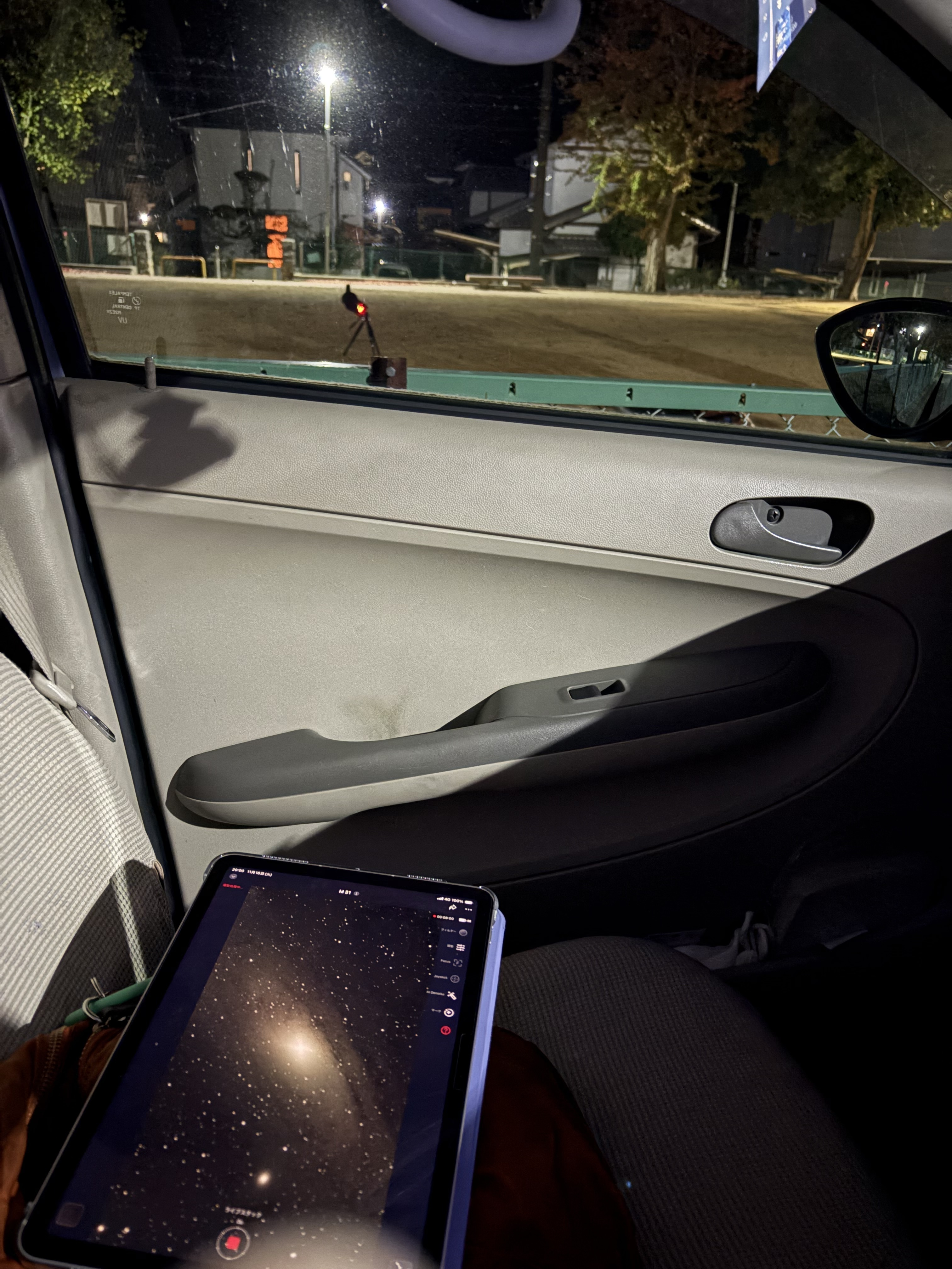 トップ > 星空部 > 車内でアンドロメダ大星雲を撮影 じょー 2025/11/18 20:11 車内でアンドロメダ大星雲を撮影 今日は北風の冷たい日でしたが、よく晴れましたので、近所の公園でSeestar S50の赤道儀モードにて、M31アンドロメダ大星雲をR2車内から撮影しています。ヒーターをつけているので寒くありません。露光の時間をカーオーディオ聴きながら過ごしています。 天体写真撮影 車内 R2 いいね 共有する 共有する X facebook LINE リンクをコピー コメントする 0 件の返信 (新着順)