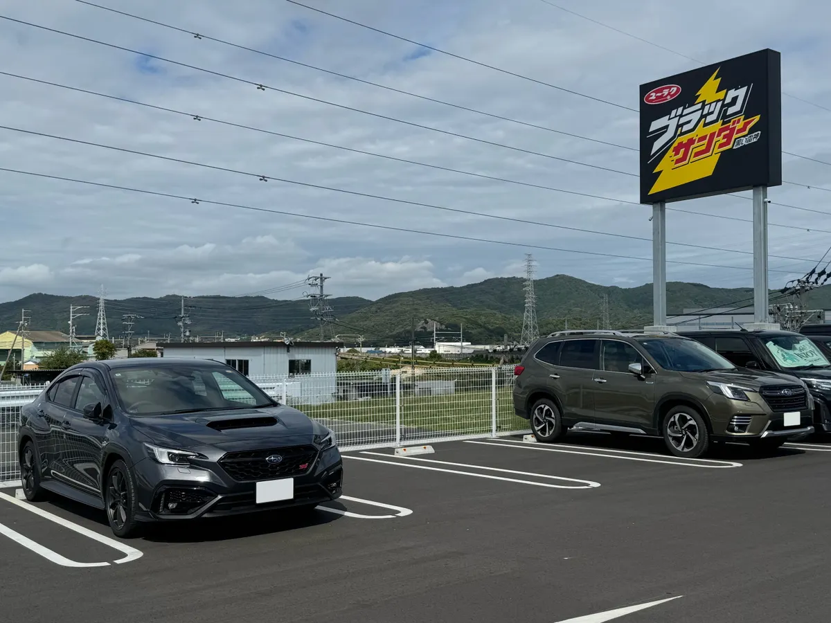 次の経由地のブラックサンダーの直営工場に着きました。看板の近くが空いていて良かった✨ 奥には新幹線が🚄