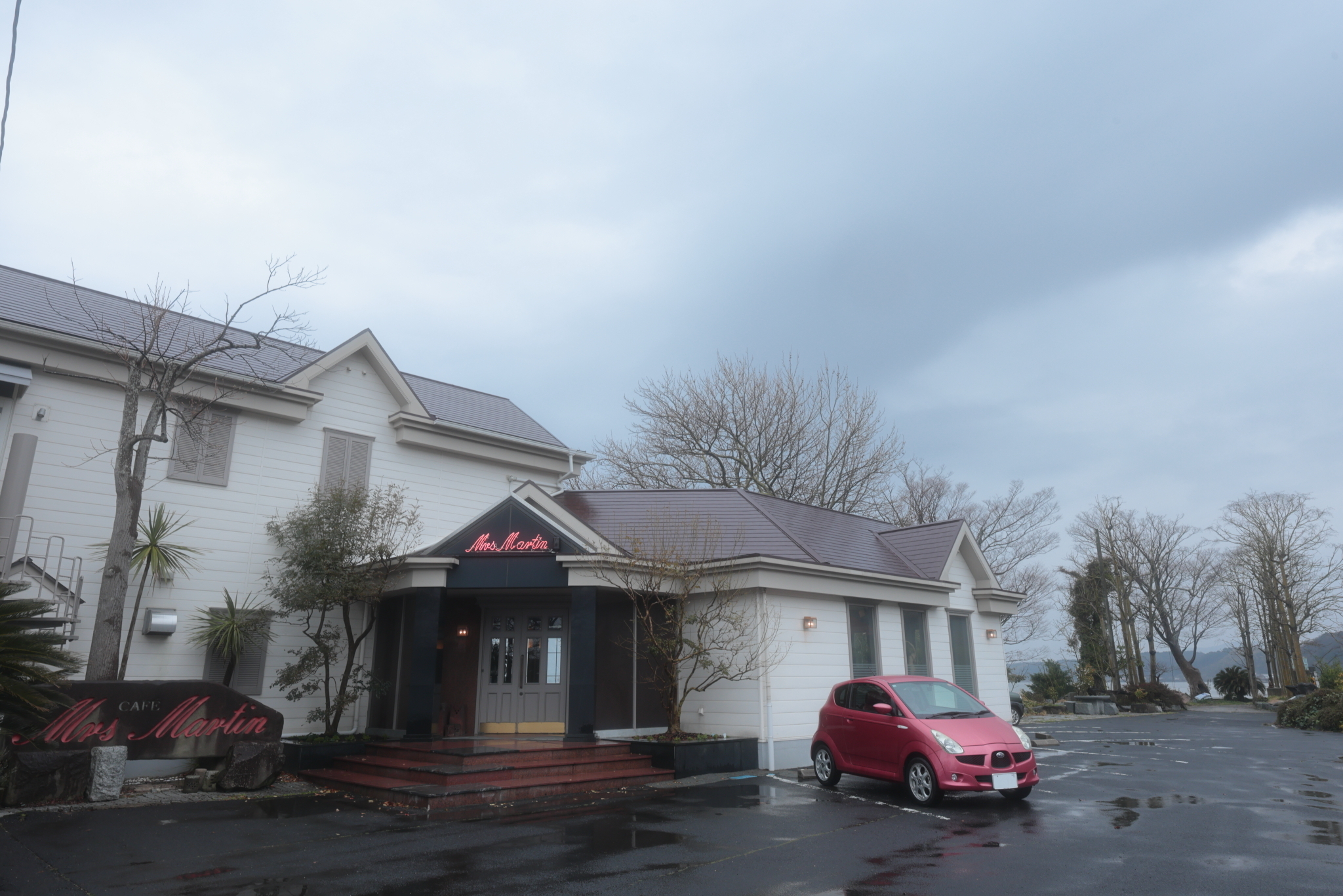 1. 松江市内から車で15分ほど、宍道湖畔に佇むカフェ「Mrs.Martin(ミセス・マーチン)」に到着しました。ここは20代の頃、山陰出張の際によく訪れていた思い出のお店です。塗り替えはされているようですが、バブル期に流行った白い外観が今も綺麗に保たれていました。