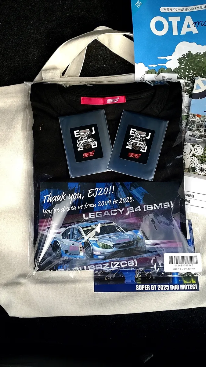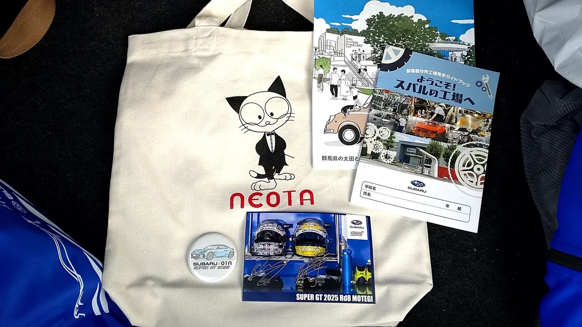 太田市側のコラボ企画特典で貰ったトートバッグ。スバル側のコラボ企画特典で貰ったポストカード。そして太田市ブースの企画で作った缶バッジ