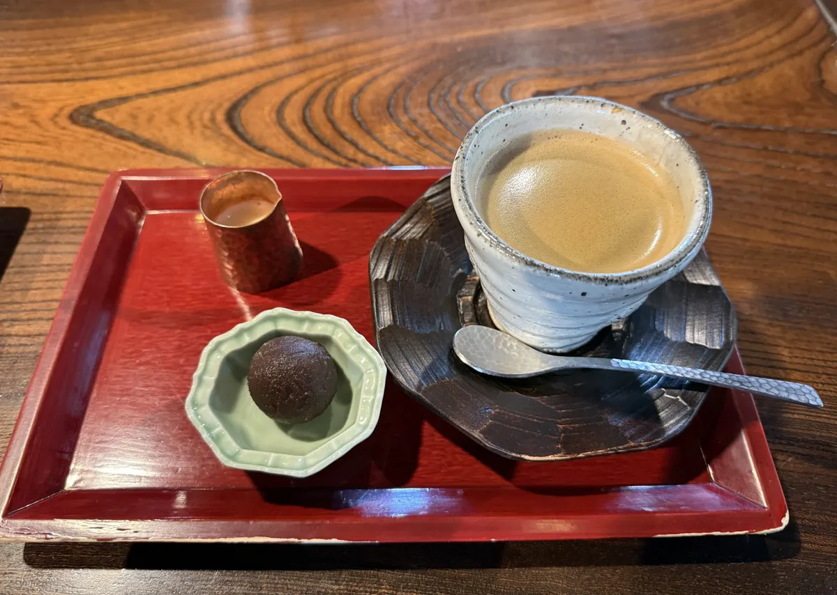 あんコーヒーは黒糖の甘味がきめ細やかなこし餡玉が添えてあり、好みによってコーヒーに入れたり、舐めながら飲むのがおすすめだそう。