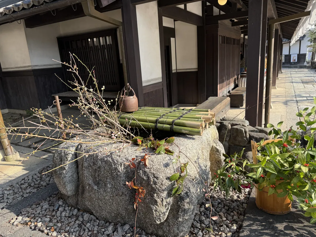 お店の外の井戸?には白梅と蝋梅、桶の中には千両の枝が生けてありました。